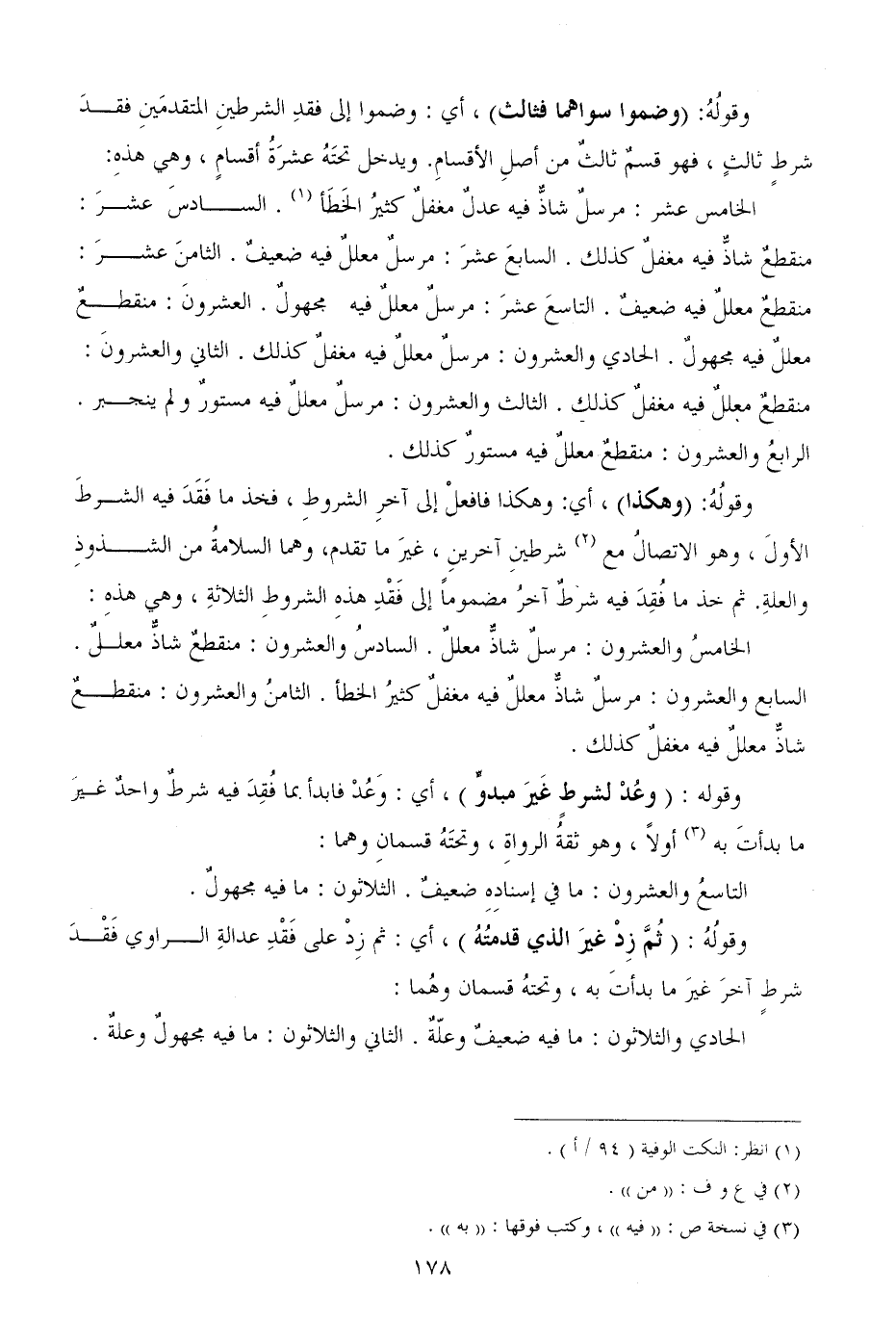 وقوله وعُدْ لشرطٍ غَيرَ مبدوٍّ، أي وَعُدْ فابدأ بما فُقِدَ فيه شرطٌ واحدٌ غيرَ ما بدأتَ به أولاً، وهو ثقةُ الرواةِ، وتحتَهُ قسمانِ وهما