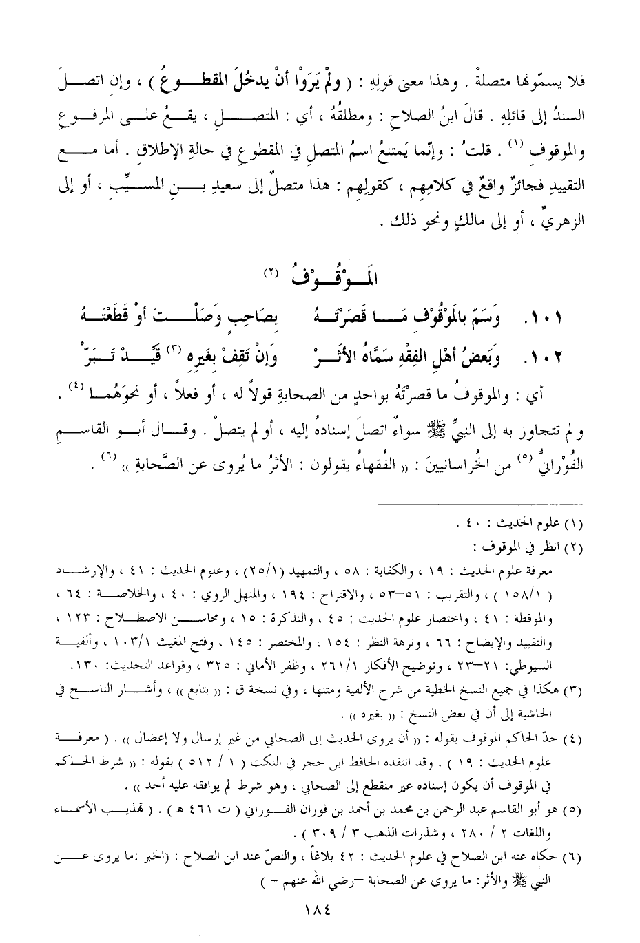أي: والموقوفُ ما قصرْتَهُ بواحدٍ من الصحابةِ قولاً له، أو فعلاً، أو نحوَهُما. ولم تتجاوز به إلى النبيِّ - صَلَّى اللهُ عَلَيْهِ وَسَلَّمَ - سواءٌ اتصلَ إسنادهُ إليه، أولم يتصلْ. وقال أبو القاسمِ الفُوْرانيُّ من الخُراسانيينَ: ((الفُقهاءُ يقولون: الأثرُ ما يُروى عن الصَّحابةِ)) .