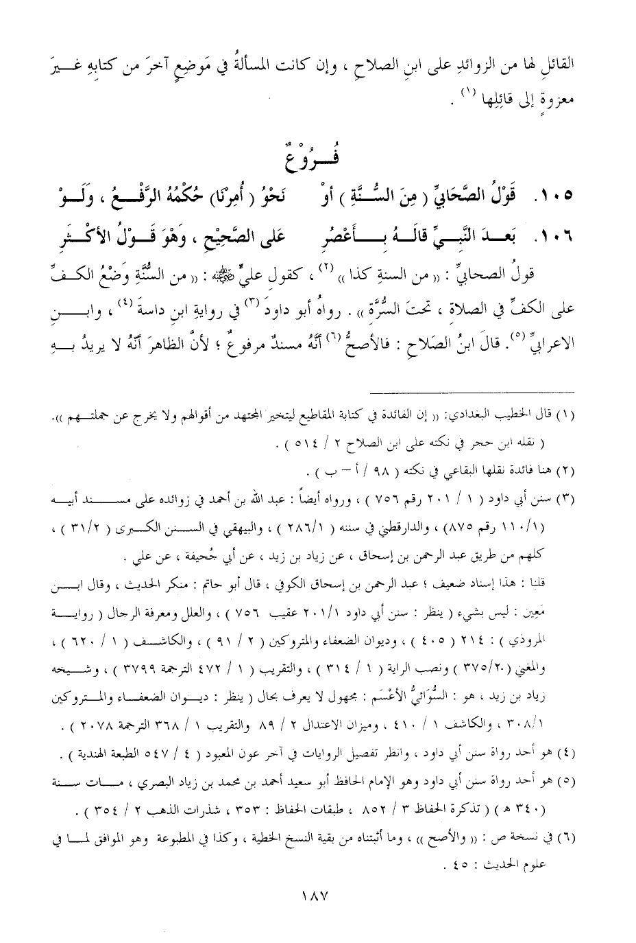 105.... قَوْلُ الصَّحَابيِّ (مِنَ السُّنَّةِ) أوْ ... نَحْوُ أُمِرْنَا حُكْمُهُ الرَّفْعُ، وَلَوْ
