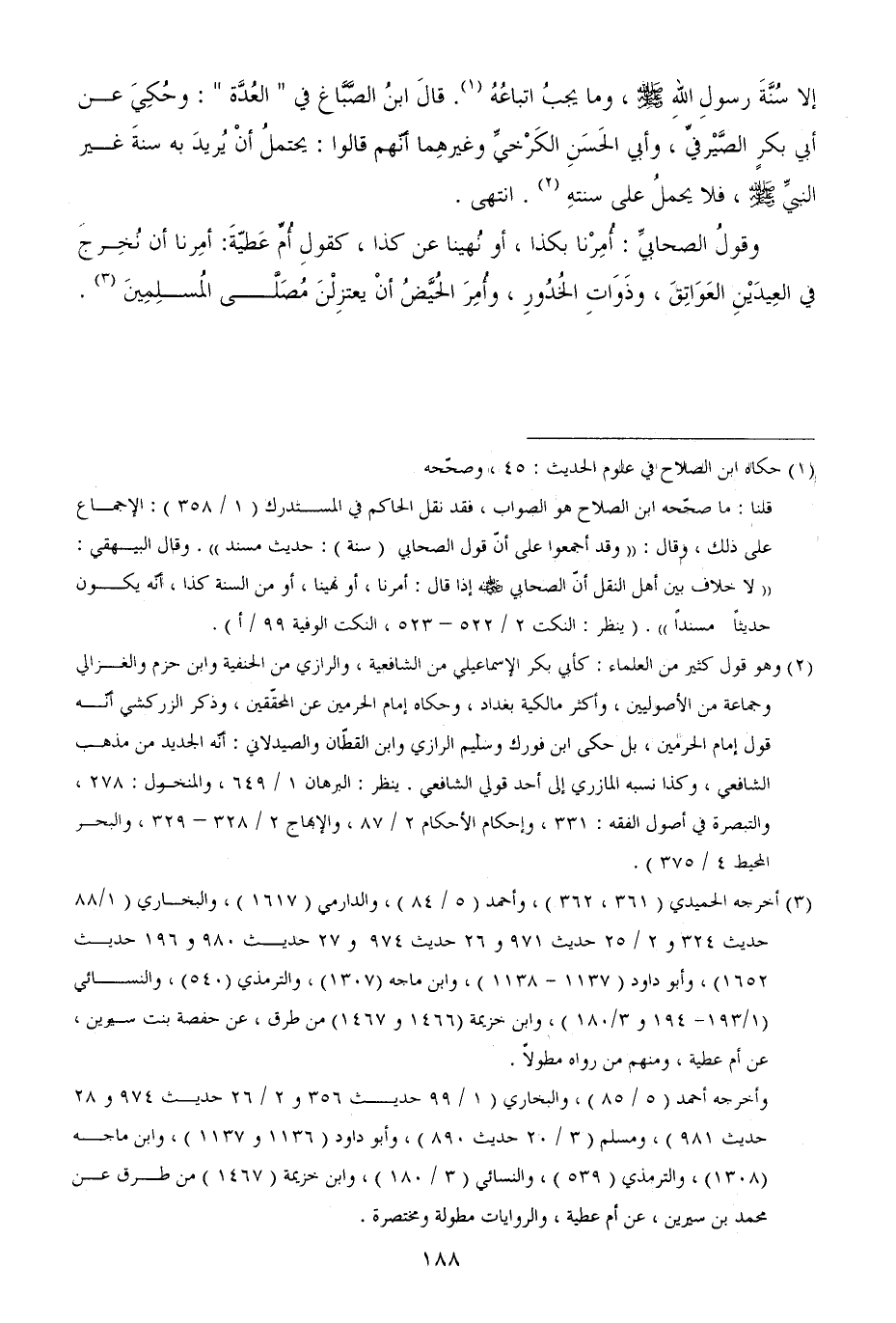 وقولُ الصحابيِّ: أُمِرْنا بكذا، أو نُهينا عن كذا، كقولِ أُمِّ عَطيّةَ: أمِرنا أن نُخِرجَ في العِيدَيْنِ العَوَاتِقَ، وذَوَاتِ الخُدُورِ، وأُمِرَ الحُيَّضُ أنْ يعتزِلْنَ مُصَلَّى المُسلِمِينَ.
