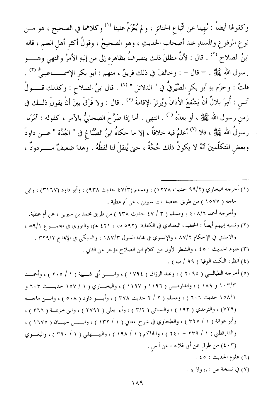 وكقولها أيضاً: نُهِينا عن اتِّباعِ الجنائزِ، ولم يُعْزَمْ علينا وكلاهما في الصحيح، هو من نوعِ المرفوعِ والمسندِ عند أصحابِ الحديثِ، وهو الصحيحُ، وقولُ أكثرِ أهلِ العلمِ، قاله ابنُ الصلاح. قال: لأنَّ مطلقَ ذلك ينصرفُ بظاهرِهِ إلى من إليهِ الأمرُ والنهي وهو رسول اللهِ - صَلَّى اللهُ عَلَيْهِ وَسَلَّمَ -. - قال -: وخالفَ في ذلك فريقٌ، منهم: أبو بكرٍ الإسماعيليُّ. قلتُ: وجزَم بهِ أبو بكرٍ الصَّيْرفيُّ في " الدلائل ". قال ابنُ الصلاحِ: وكذلك قولُ أنسٍ: أُمِرَ بلالٌ أنْ يَشْفعَ الأَذانَ ويُوترَ الإقامةَ. قال: ولا فَرْقَ بينَ أنْ يقولَ ذلك في زمنِ رسول الله - صَلَّى اللهُ عَلَيْهِ وَسَلَّمَ -، أو بعدَهُ. انتهى. أما إذا صَرَّحَ الصحابيُّ بالآمر، كقوله: أمَرَنا رسولُ الله - صَلَّى اللهُ عَلَيْهِ وَسَلَّمَ -، فلا أعلمُ فيه خلافاً، إلا ما حكاهُ ابنُ الصَّبَّاغِ في " العُدَّة " عن داودَ وبعضِ المتكلّمينَ أنّهُ لا يكونُ ذلك حُجَّةً، حتى يُنقلَ لنا لفظُهُ. وهذا ضعيفٌ مردودٌ،