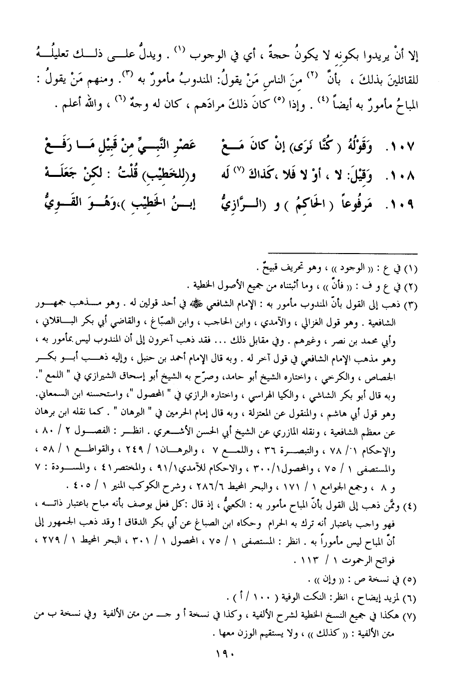 إلا أنْ يريدوا بكونِهِ لا يكونُ حجةً، أي في الوجوب. ويدلُّ على ذلك تعليلُهُ للقائلينَ بذلكَ، بأنَّ مِنَ الناسِ مَنْ يقولُ: المندوبُ مأمورٌ به. ومنهم مَنْ يقولُ: المباحُ مأمورٌ به أيضاً. وإذا كانَ ذلكَ مرادَهم، كان له وجهٌ، والله أعلم.