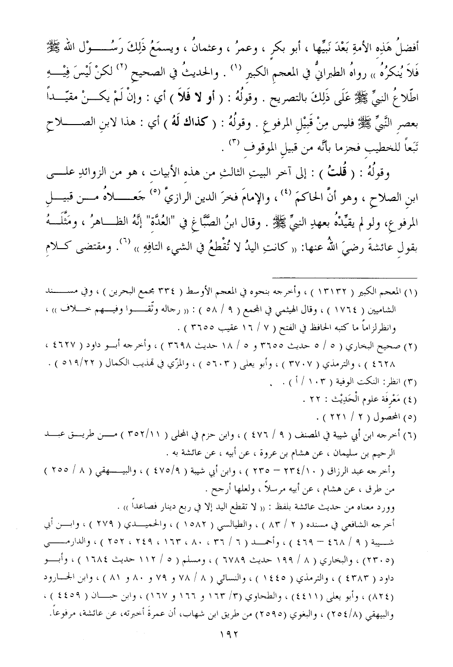 وقولُهُ قُلتُ إلى آخر البيتِ الثالثِ من هذهِ الأبياتِ، هو من الزوائدِ على ابنِ الصلاحِ، وهو أنَّ الحاكمَ، والإمامَ فخرَ الدين الرازيَّ جَعلاهُ من قبيلِ المرفوعِ، ولولم يقيِّدْهُ بعهدِ النبيِّ - صَلَّى اللهُ عَلَيْهِ وَسَلَّمَ - وقال ابنُ الصَّبَّاغِ في العُدَّةِ إنَّهُ الظاهرُ، ومَثَّلَهُ بقولِ عائشةَ رضيَ اللهُ عنها كانتِ اليدُ لا تُقْطعُ في الشيء التافِهِ ومقتضى كلامِ
