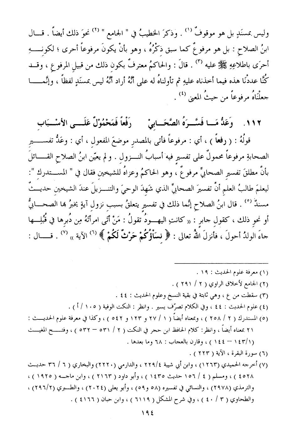 قولُهُ: (رفعاً) ، أي: مرفوعاً فأتى بالمصدرِ موضعَ المفعولِ، أي: وعَدُّ تفسيرِ الصحابةِ مرفوعاً محمولٌ على تفسيرٍ فيه أسبابُ النزولِ. ولم يعيّن ابنُ الصلاحِ القائلَ بأنَّ مطلقَ تفسيرِ الصحابيِّ مرفوعٌ، وهو الحاكمُ وعزاهُ للشيخينِ فقال في " المستدركِ ": ليعلمَ طالبُ العلمِ أنَّ تفسيرَ الصحابيِّ الذي شَهِدَ الوحيَ والتنزيلَ عندَ الشيخينِ حديثٌ مسندٌ. قال ابنُ الصلاحِ إنَّما ذلك في تفسيرٍ يتعلقُ بسببِ نزولِ آيةٍ يخبرُ بها الصحابيُّ أو نحوِ ذلك، كقولِ جابرٍ: ((كانتِ اليهودُ تقولُ: مَنْ أتَى امرأتَهُ مِن دُبرِها في قُبُلِها جاءَ الولدُ أحولَ، فأنزلَ اللهُ تعالى: {نِسَاْؤُكُمْ حَرْثٌ لَكُمْ} الآية)) . قال: