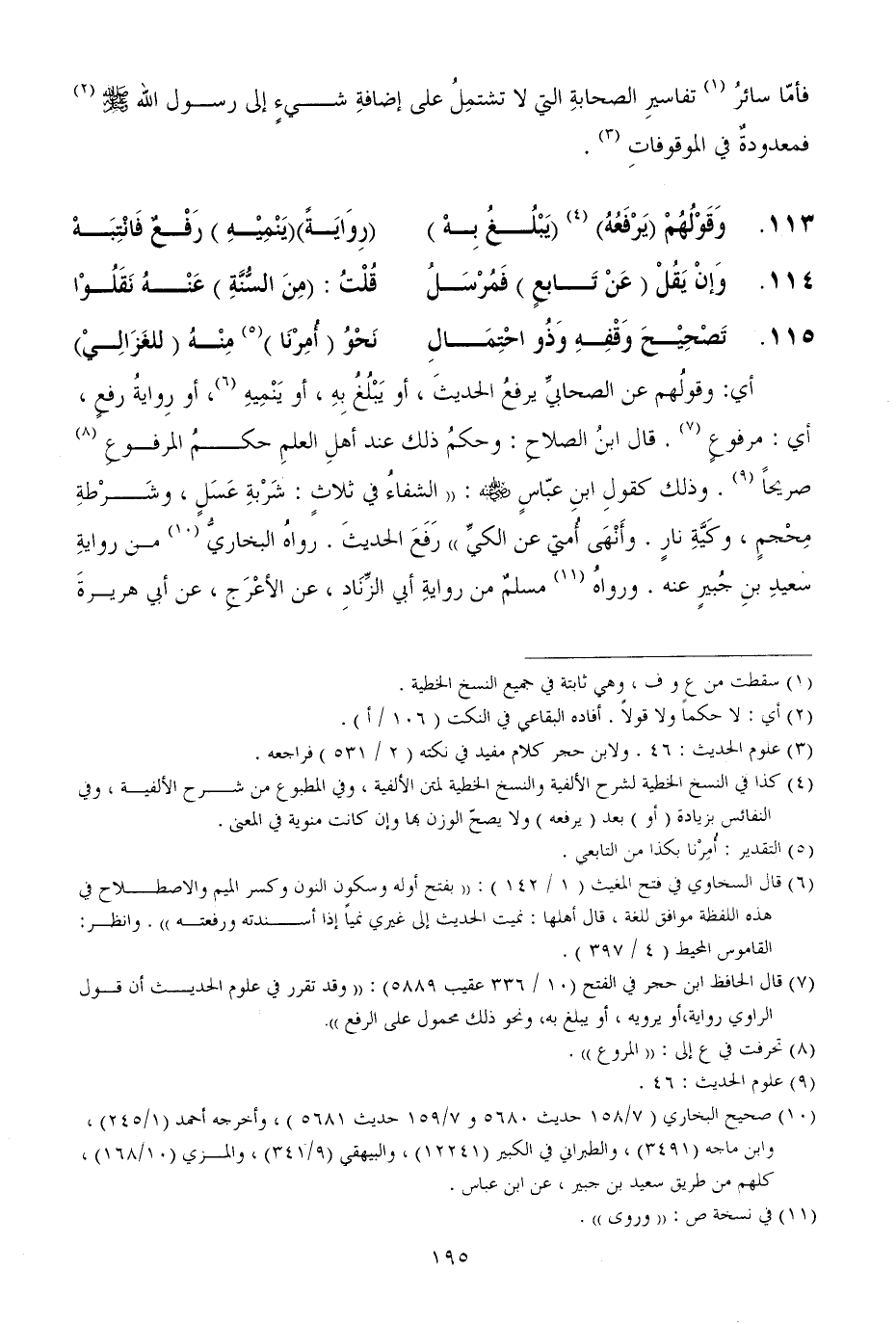 أي وقولُهم عن الصحابيِّ يرفعُ الحديثَ، أو يَبْلُغُ بِهِ، أو يَنْمِيهِ، أو رِوايةُ رفعٍ، أي مرفوعٍ قال ابنُ الصلاحِ وحكمُ ذلك عند أهلِ العلمِ حكمُ المرفوعِ صريحاً وذلك كقولِ ابنِ عبّاسٍ - رضي الله عنه - الشفاءُ في ثلاثٍ شَرْبةِ عَسَلٍ، وشَرْطةِ مِحْجمٍ، وكَيَّةِ نارٍ وأَنْهَى أُمتي عن الكيِّ رَفَعَ الحديثَ رواهُ البخاريُّ من روايةِ سعيدِ بنِ جُبيرٍ عنه ورواهُ مسلمٌ من روايةِ أبي الزِّنَادِ، عن الأعْرَجِ، عن أبي هريرةَ