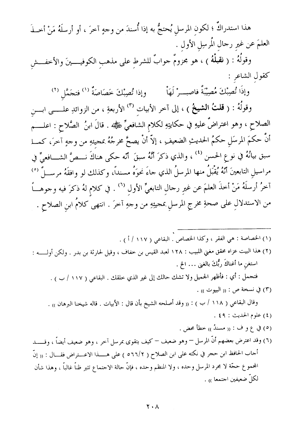 وقولُهُ قلتُ الشيخُ، إلى آخر الأبياتِ الأربعةِ، من الزوائدِ على ابنِ الصلاحِ، وهو اعتراضٌ عليهِ في حكايتِهِ لكلامِ الشافعيِّ - رضي الله عنه - قالَ ابنُ الصَّلاحِ اعلم أنَّ حكمَ المرسَلِ حكمُ الحديثِ الضعيفِ، إلاّ أنْ يصحَّ مخرجُهُ بمجيِئهِ من وجهٍ آخرَ، كما سبق بيانُهُ في نوعِ الحسن، والذي ذكرَ أنَّهُ سبقَ أنّه حكى هناكَ نصَّ الشافعيِّ في مراسيلِ التابعينَ أنّهُ يُقْبَلُ منها المرسلُ الذي جاءَ نحوَهُ مسنداً، وكذلك لو وافقَهُ مرسلٌ آخرُ أرسلَهُ مَنْ أخذَ العلمَ عن غيرِ رجالِ التابعيِّ الأولِ في كلامٍ لهُ ذكرَ فيه وجوهاً من الاستدلالِ على صحةِ مخرجِ المرسلِ بمجيئِهِ من وجهِ آخرَ انتهى كلامُ ابنِ الصلاحِ