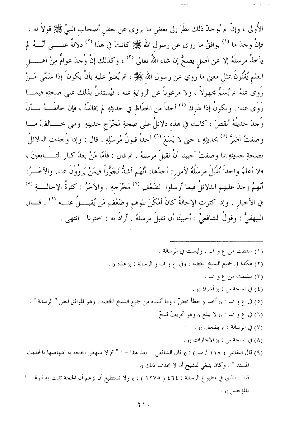 الأُولى، وإنْ لم يُوجدْ ذلك نظَرَ إلى بعضِ ما يروى عن بعضِ أصحابِ النبيِّ - صَلَّى اللهُ عَلَيْهِ وَسَلَّمَ - قولاً له، فإنْ وجدَ ما يوافقُ ما روى عن رسولِ الله - صَلَّى اللهُ عَلَيْهِ وَسَلَّمَ - كانتْ في هذا دلالةٌ على أنَّهُ لم يأخذْ مرسلَهُ إلا عن أصلٍ يصحُّ إن شاء اللهُ تعالى، وكذلك إنْ وُجدَ عوامُّ مِنْ أهلِ العلمِ يُفْتُونَ بمثلِ معنى ما روي عن رسول اللهِ - صَلَّى اللهُ عَلَيْهِ وَسَلَّمَ -، ثم يُعتبرُ عليهِ بأنْ يكونَ إذا سَمَّى مَنْ رَوَى عنهُ لم يُسَمِّ مجهولاً، ولا مرغوباً عن الروايةِ عنه، فيُستدلُّ بذلك على صحتِهِ فيما رَوَى عنه ويكونُ إذا شَرِكَ أحداً من الحفّاظِ في حديثِهِ لم يخالفْهُ، فإن خالفَهُ بأنْ وُجدَ حديثُهُ أنقصَ، كانت في هذهِ دلائلُ على صحةِ مَخْرَجِ حديثِهِ ومتى خالفَ ما وصفتُ أضَرَّ بحديثِهِ، حتى لا يَسَعَ أحداً قبولُ مُرسَلِهِ قال وإذا وُجدتِ الدلائلُ بصحةِ حديثهِ بما وصفتُ أحببنا أنْ نقبلَ مرسلَهُ ثم قال فأمّا مَنْ بعدَ كبارِ التابعينَ، فلا أعلمُ واحداً يُقْبَلُ مرسَلُهُ لأمورٍ أحدُها أنَّهُم أشدُّ تَجَوُّزاً فيمَنْ يَروُوْنَ عنه والآخَرُ أنّهمُ وجدَ عليهم الدلائلُ فيما أرسلوا لضَعْفِ مَخْرَجِهِ والآخَرُ كثرةُ الإحالةِ في الأخبارِ وإذا كثرتِ الإحالةُ كانَ أمْكَنَ للوهمِ وضَعْفِ مَن يُقبلُ عنه قال البيهقيُّ وقولُ الشافعيِّ أحببنَا أن نقبلَ مرسلَهُ أرادَ به اخترنا انتهى