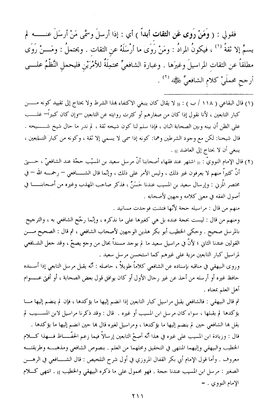 فقولي وَمَنْ رَوى عَن الثقاتِ أبداً أي إذا أرسلَ وسمَّى مَنْ أرسَلَ عنه لم يسمِّ إلا ثقةً، فيكونُ المرادُ ومَنْ رَوَى ما أرْسَلَهُ عنِ الثقاتِ ويحتملُ ومَنْ رَوَى مطلقاً عن الثقاتِ المراسيلَ وغيرَها وعبارة الشافعيِّ محتمِلَةٌ للأمْرَيْنِ فليحملِ النَّظْمُ على أرجحِ محملَيْ كلامِ الشافعيِّ - رضي الله عنه -
