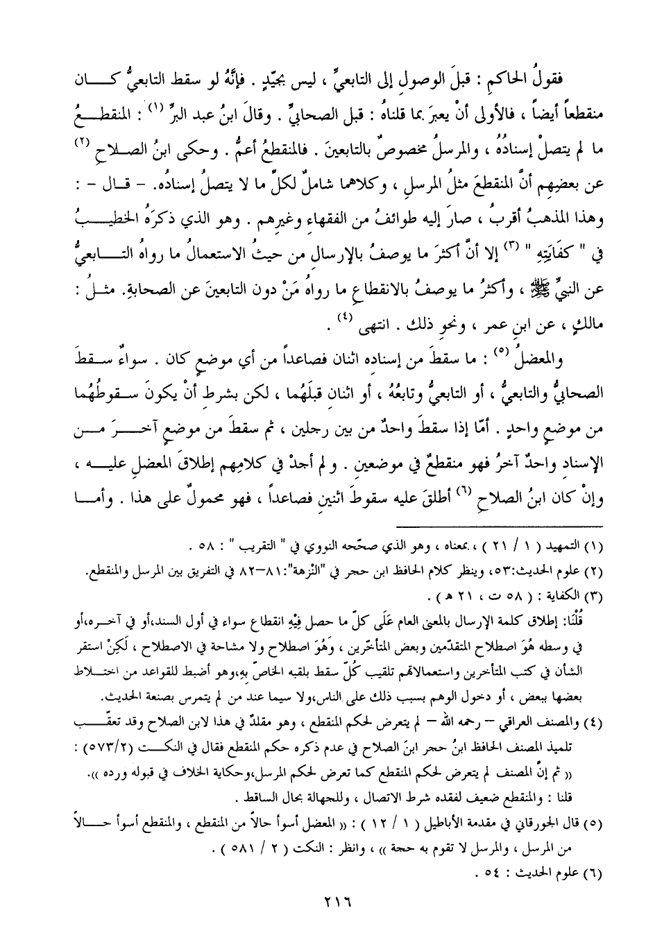 فقولُ الحاكمِ: قبلَ الوصولِ إلى التابعيِّ، ليس بجيّدٍ. فإنَّهُ لو سقط التابعيُّ كان منقطعاً أيضاً، فالأولى أنْ يعبرَ بما قلناهُ: قبل الصحابيِّ. وقالَ ابنُ عبد البرِّ: المنقطعُ ما لم يتصلْ إسنادُهُ، والمرسلُ مخصوصٌ بالتابعينَ. فالمنقطعُ أعمُّ. وحكى ابنُ الصلاحِ عن بعضِهِم أنَّ المنقطعَ مثلُ المرسلِ، وكلاهما شاملٌ لكلِّ ما لا يتصلُ إسنادُه. - قال -: وهذا المذهبُ أقربُ، صارَ إليه طوائفُ من الفقهاءِ وغيرِهم. وهو الذي ذكرَهُ الخطيبُ في " كفَايَتِهِ " إلا أنَّ أكثرَ ما يوصفُ بالإرسالِ من حيثُ الاستعمالُ ما رواهُ التابعيُّ عن النبيِّ - صَلَّى اللهُ عَلَيْهِ وَسَلَّمَ -، وأكثرُ ما يوصفُ بالانقطاعِ ما رواهُ مَنْ دون التابعينَ عن الصحابةِ. مثلُ: مالكٍ، عن ابنِ عمر، ونحوِ ذلك. انتهى.