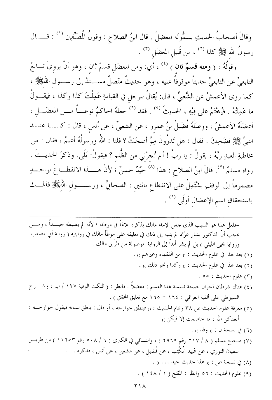 النبيِّ - صَلَّى اللهُ عَلَيْهِ وَسَلَّمَ - فضَحِكَ. فقال: هل تَدرُونَ مِمَّ أضحَكُ؟ قلنا: اللهُ ورسولُهُ أعلمُ، فقال: من مخاطبةِ العبدِ ربَّهُ، يقولُ: يا ربِّ! ألم تُجِرْنِي من الظُّلمِ؟ فيقولُ: بَلَى. وذكرَ الحديثَ. رواه مسلمٌ. قالَ ابنُ الصلاحِ: هذا جيّدٌ حسنٌ؛ لأنَّ هذا الانقطاعَ بواحدٍ مضموماً إلى الوقفِ يشْتَمِلُ على الانقطاعِ باثنينِ: الصحابيِّ، ورسولِ اللهِ - صَلَّى اللهُ عَلَيْهِ وَسَلَّمَ - فذلك باستحقاقِ اسمِ الإعضالِ أولَى.