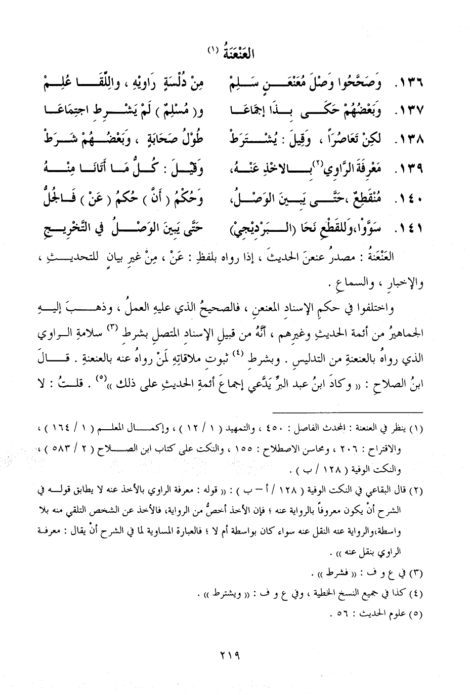136.... وَصَحَّحُوا وَصْلَ مُعَنْعَنٍ سَلِمْ ... مِنْ دُلْسَةٍ رَاويْهِ، والِلِّقَا عُلِمْ