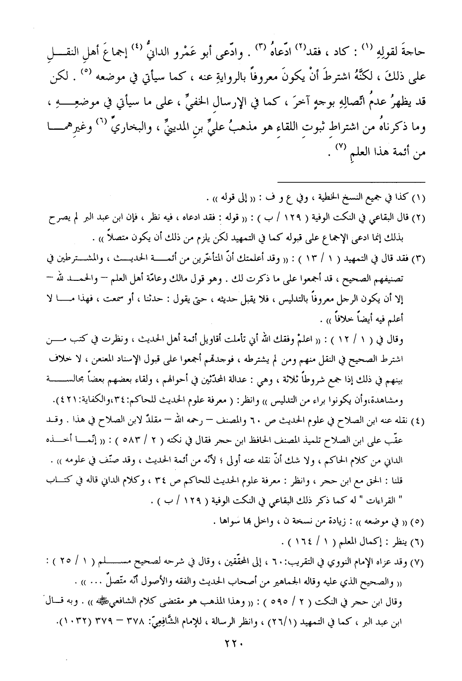 حاجةَ لقولِهِ: كاد، فقد ادّعاهُ. وادّعى أبو عَمْرو الدانيُّ إجماعَ أهلِ النقلِ على ذلكَ، لكنَّهُ اشترطَ أنْ يكونَ معروفاً بالروايةِ عنه، كما سيأتي في موضعه. لكن قد يظهرُ عدمُ اتّصالِهِ بوجهٍ آخرَ، كما في الإرسالِ الخفيِّ، على ما سيأتي في موضعِهِ، وما ذكرناهُ من اشتراطِ ثبوتِ اللقاءِ هو مذهبُ عليِّ بنِ المدينيِّ، والبخاريِّ وغيرِهما من أئمة هذا العلمِ.