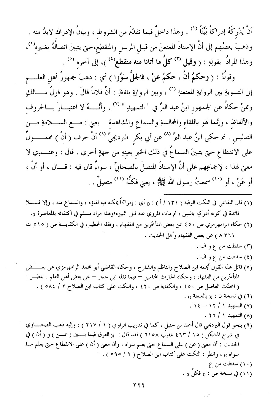 أنْ يُدْرِكَهُ إدراكاً بَيِّنَاً. وهذا داخلٌ فيما تقدّمَ من الشروطِ، وبيانُ الإدراكِ لابدَّ منه. وذهبَ بعضُهم إلى أنَّ الإسنادَ المعنعنَ من قبيلِ المرسلِ والمنقطعِ، حتى يتبينَ اتصالُهُ بغيرهِ، وهذا المرادُ بقولِهِ: (وقيل كلُّ ما أتانا منه منقطع) ، إلى آخرهِ.