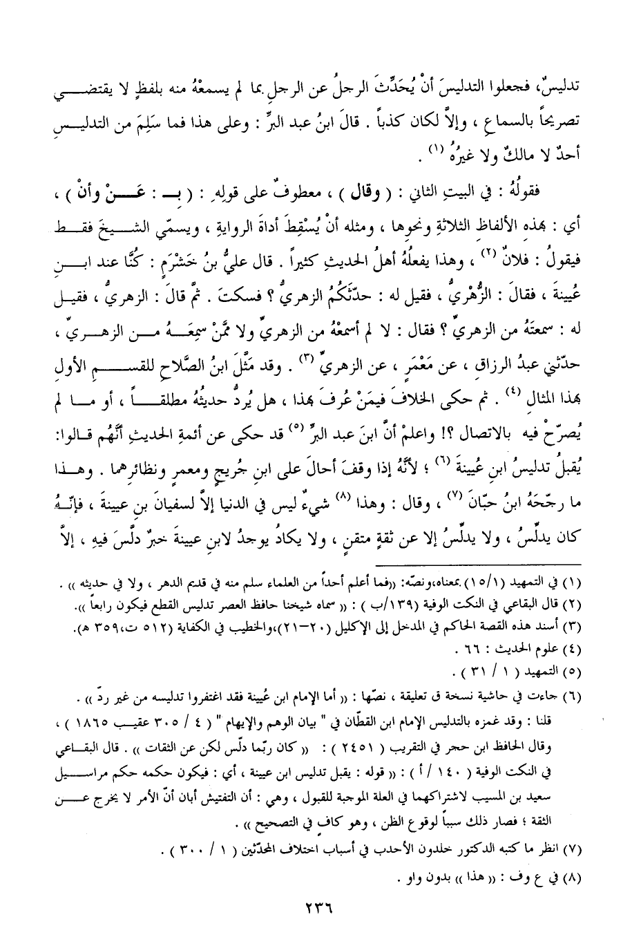 فقولُهُ: في البيتِ الثاني: (وقال) ، معطوفٌ على قولِهِ: (بِـ: عَنْ وأنْ) ، أي: بهذهِ الألفاظِ الثلاثةِ ونحوِها، ومثله أنْ يُسْقِطَ أداةَ الروايةِ، ويسمّي الشيخَ فقط فيقولُ: فلانٌ، وهذا يفعلُهُ أهلُ الحديثِ كثيراً. قال عليُّ بنُ خَشْرَمٍ: كُنَّا عند ابنِ عُيينةَ، فقالَ: الزُّهْريُّ، فقيل له: حدّثَكُمُ الزهريُّ؟ فسكتَ. ثمَّ قالَ: الزهريُّ، فقيل له: سمعتَهُ من الزهريِّ؟ فقال: لا لم أسمعْهُ من الزهريِّ ولا ممَّنْ سمِعَهُ من الزهريِّ، حدّثني عبدُ الرزاقِ، عن مَعْمَرٍ، عن الزهريِّ. وقد مَثَّلَ ابنُ الصَّلاحِ للقسمِ الأولِ بهذا المثالِ. ثم حكى الخلافَ فيمَنْ عُرفَ بهذا، هل يُردُّ حديثُهُ مطلقاً، أو ما لم يُصرّحْ فيه بالاتصال؟! واعلمْ أنَّ ابنَ عبد البرِّ قد حكى عن أئمةِ الحديثِ أنَّهُم قالوا: يُقبلُ تدليسُ ابنِ عُيينةَ؛ لأنَّهُ إذا وقفَ أحالَ على ابنِ جُريجٍ ومعمرٍ ونظائرِهما. وهذا ما رجّحَهُ ابنُ حبّانَ، وقال: وهذا شيءٌ ليس في الدنيا إلاَّ لسفيانَ بنِ عيينةَ، فإنّهُ كان يدلِّسُ، ولا يدلِّسُ إلا عن ثقةٍ متقنٍ، ولا يكادُ يوجدُ لابنِ عيينةَ خبرٌ دلَّسَ فيهِ، إلاَّ