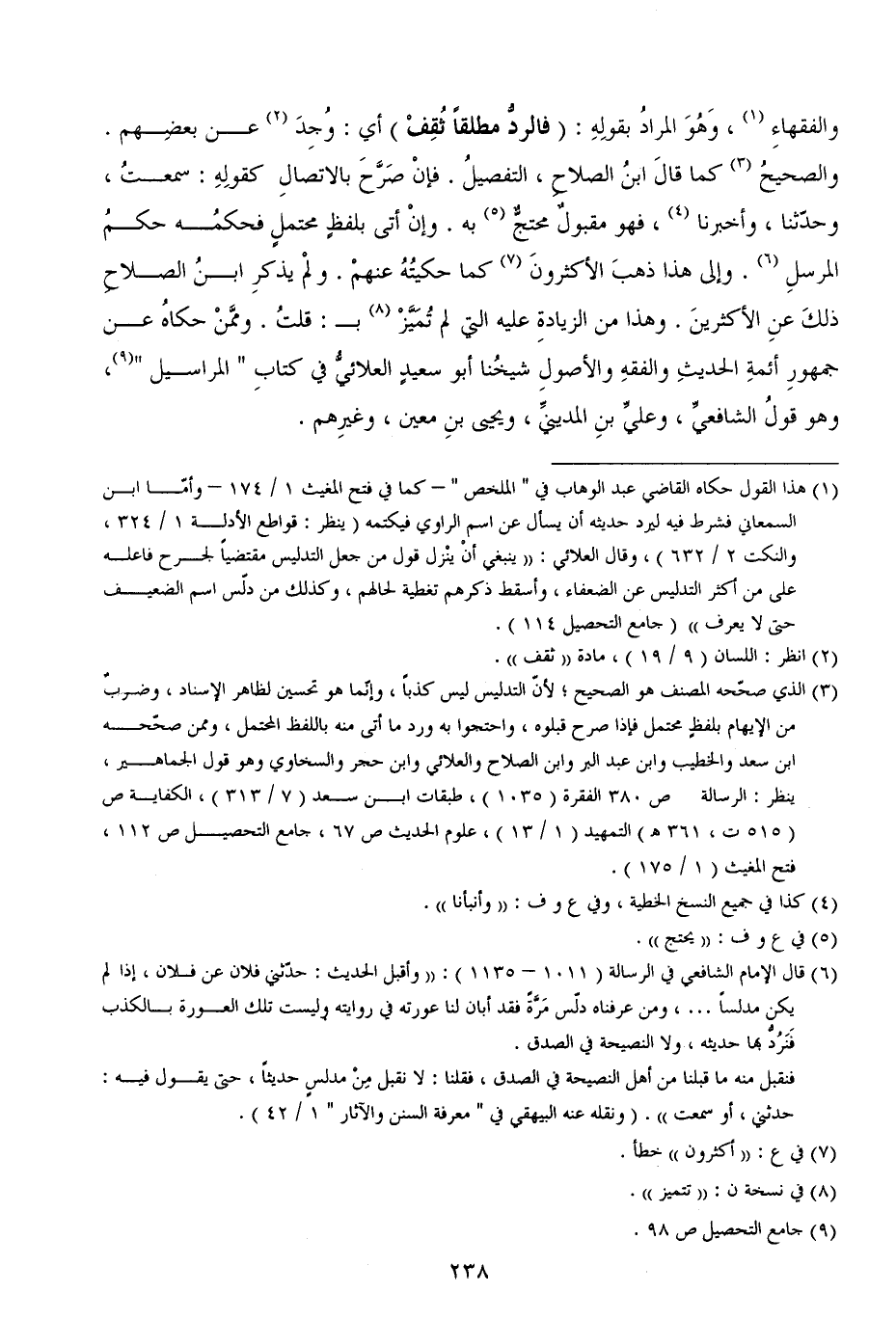 والفقهاءِ، وَهُوَ المرادُ بقولِهِ: (فالردُّ مطلقاً ثُقِفْ) أي: وُجِدَ عن بعضِهم. والصحيحُ كما قالَ ابنُ الصلاحِ، التفصيلُ. فإنْ صَرَّحَ بالاتصالِ كقولِهِ: سمعتُ، وحدّثنا، وأخبرنا، فهو مقبولٌ محتجٌّ به. وإنْ أتى بلفظٍ محتملٍ فحكمُه حكمُ المرسلِ. وإلى هذا ذهبَ الأكثرونَ كما حكيتُهُ عنهمْ. ولمْ يذكرِ ابنُ الصلاحِ ذلكَ عنِ الأكثرينَ. وهذا من الزيادةِ عليه التي لم تُمَيَّزْ بـ: قلتُ. وممَّنْ حكاهُ عن جمهورِ أئمةِ الحديثِ والفقهِ والأصولِ شيخُنا أبو سعيدٍ العلائيُّ في كتابِ " المراسيل "، وهو قولُ الشافعيِّ، وعليِّ بنِ المدينيِّ، ويحيى بنِ معين، وغيرِهم.