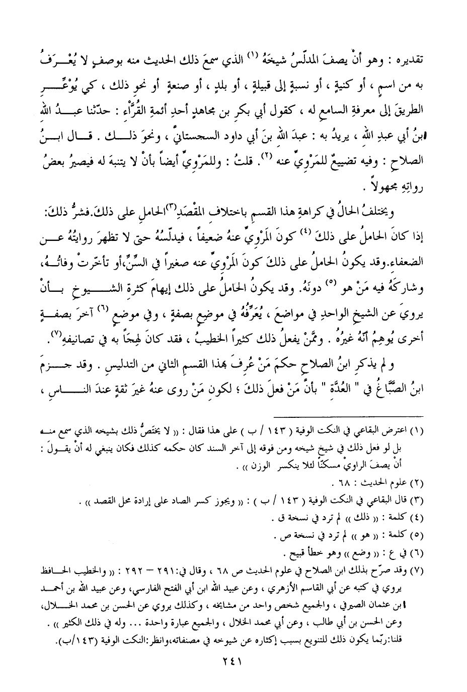تقديره: وهو أنْ يصفَ المدلّسُ شيخَهُ الذي سمعَ ذلك الحديث منه بوصفٍ لا يُعْرَفُ به من اسمٍ، أو كنيةٍ، أو نسبةٍ إلى قبيلةٍ، أو بلدٍ، أو صنعةٍ أو نحوِ ذلك، كي يُوْعِّرِ الطريقَ إلى معرفةِ السامعِ له، كقول أبي بكرِ بن مجاهدٍ أحدِ أئمةِ القُرَّاْءِ: حدّثنا عبدُ اللهِ بنُ أبي عبدِ اللهِ، يريدُ به: عبدَ اللهِ بنَ أبي داود السجستانيَّ، ونحوَ ذلك. قال ابنُ الصلاحِ: وفيه تضييعٌ للمَرْوِيِّ عنه. قلتُ: وللمَرْوِيِّ أيضاً بأنْ لا يتنبهَ له فيصيرُ بعضُ رواتِهِ مجهولاً.