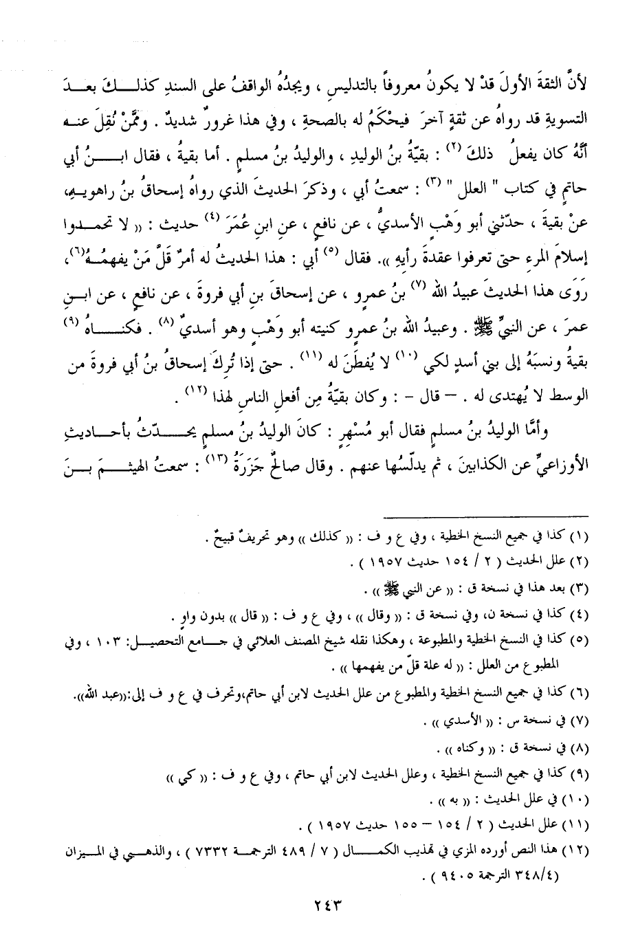 لأنَّ الثقةَ الأولَ قدْ لا يكونُ معروفاً بالتدليسِ، ويجدُهُ الواقفُ على السندِ كذلكَ بعدَ التسويةِ قد رواهُ عن ثقةٍ آخرَ فيحْكَمُ له بالصحةِ، وفي هذا غرورٌ شديدٌ. وممَّنْ نُقِلَ عنه أنَّهُ كان يفعلُ ذلكَ: بقيّةُ بنُ الوليدِ، والوليدُ بنُ مسلمٍ. أما بقيةُ، فقال ابنُ أبي حاتمٍ في كتاب " العلل ": سمعتُ أبي، وذكرَ الحديثَ الذي رواهُ إسحاقُ بنُ راهويهِ، عنْ بقيةَ، حدّثني أبو وَهْبٍ الأسديُّ، عن نافعٍ، عنِ ابنِ عُمَرَ حديث: ((لا تحمدوا إسلامَ المرءِ حتى تعرفوا عقدةَ رأيِهِ)) . فقال أبي: هذا الحديثُ له أمرٌ قَلَّ مَنْ يفهمُهُ، رَوَى هذا الحديثَ عبيدُ الله بنُ عمرٍو، عن إسحاقَ بنِ أبي فروةَ، عن نافعٍ، عن ابنِ عمرَ، عن النبيِّ (. وعبيدُ الله بنُ عمرٍو كنيته أبو وَهْبٍ وهو أسديٌ. فكناهُ بقيةُ ونسبَهُ إلى بني أسدٍ لكي لا يُفطَنَ له. حتى إذا تُرِكَ إسحاقُ بنُ أبي فروةَ من الوسط لا يُهتدى له. - قال -: وكان بقيّةُ مِن أفعلِ الناسِ لهذا.