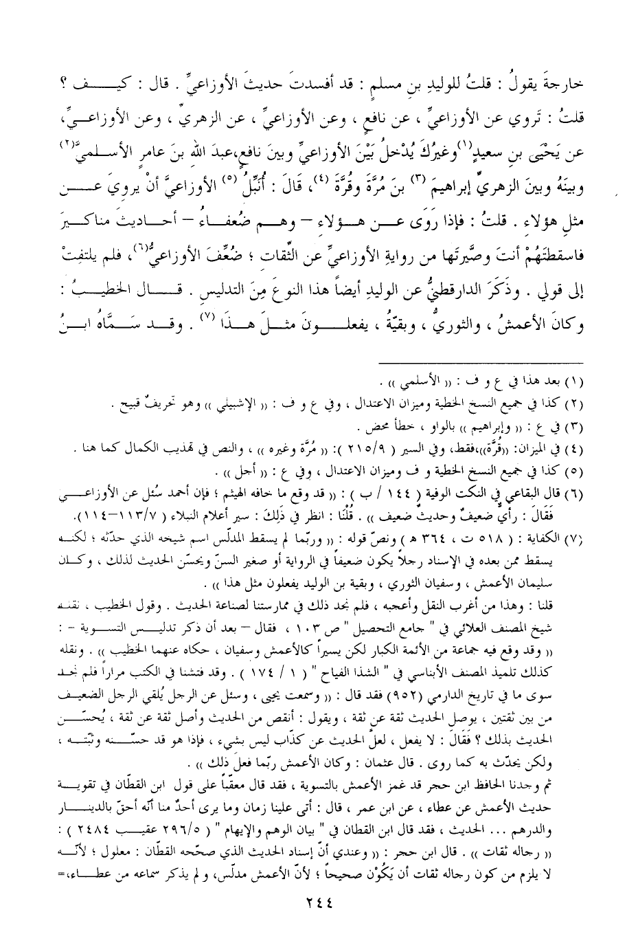 خارجةَ يقولُ: قلتُ للوليدِ بنِ مسلمٍ: قد أفسدتَ حديثَ الأوزاعيِّ. قال: كيف؟ قلتُ: تَروي عن الأوزاعيِّ، عن نافعٍ، وعن الأوزاعيِّ، عن الزهريِّ، وعن الأوزاعيِّ، عن يَحْيَى بنِ سعيدٍوغيرُكَ يُدْخلُ بَيْنَ الأوزاعيِّ وبينَ نافعٍ، عبدَ اللهِ بنَ عامرٍ الأسلميَّ وبينَهُ وبينَ الزهريِّ إبراهيمَ بنَ مُرَّةَ وقُرَّةَ، قَالَ: أُنَبِّلُ الأوزاعيَّ أنْ يروِيَ عن مثلِ هؤلاءِ. قلتُ: فإذا رَوَى عن هؤلاءِ - وهم ضُعفاءُ - أحاديثَ مناكيرَ فاسقطتَهُمْ أنتَ وصَّيرتَها من روايةِ الأوزاعيِّ عن الثِّقاتِ؛ ضُعِّفَ الأوزاعيُّ، فلم يلتفِتْ إلى قولي. وذَكَرَ الدارقطنيُّ عن الوليدِ أيضاً هذا النوعَ مِنَ التدليسِ. قال الخطيبُ: