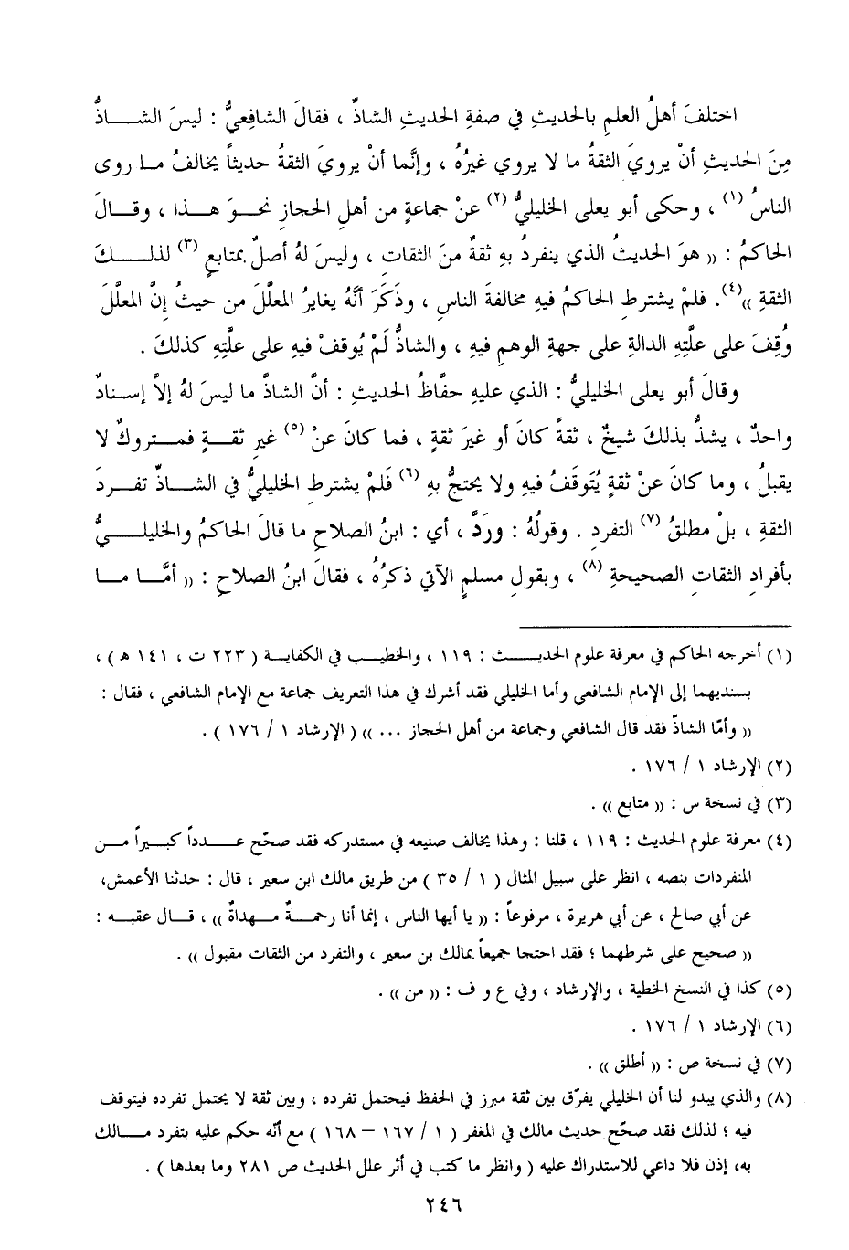 وقالَ أبو يعلى الخليليُّ: الذي عليهِ حفَّاظُ الحديثِ: أنَّ الشاذَّ ما ليسَ لهُ إلاَّ إسنادٌ واحدٌ، يشذُّ بذلكَ شيخٌ، ثقةً كانَ أو غيرَ ثقةٍ، فما كانَ عنْ غيرِ ثقةٍ فمتروكٌ لا يقبلُ، وما كانَ عنْ ثقةٍ يُتَوقَفُ فيهِ ولا يحتجُّ بهِ فَلمْ يشترطِ الخليليُّ في الشاذِّ تفردَ الثقةِ، بلْ مطلقُ التفردِ. وقولُهُ: ورَدَّ، أي: ابنُ الصلاحِ ما قالَ الحاكمُ والخليليُّ بأفرادِ الثقاتِ الصحيحةِ، وبقولِ مسلمٍ الآتي ذكرُهُ، فقالَ ابنُ الصلاحِ: ((أمَّا ما