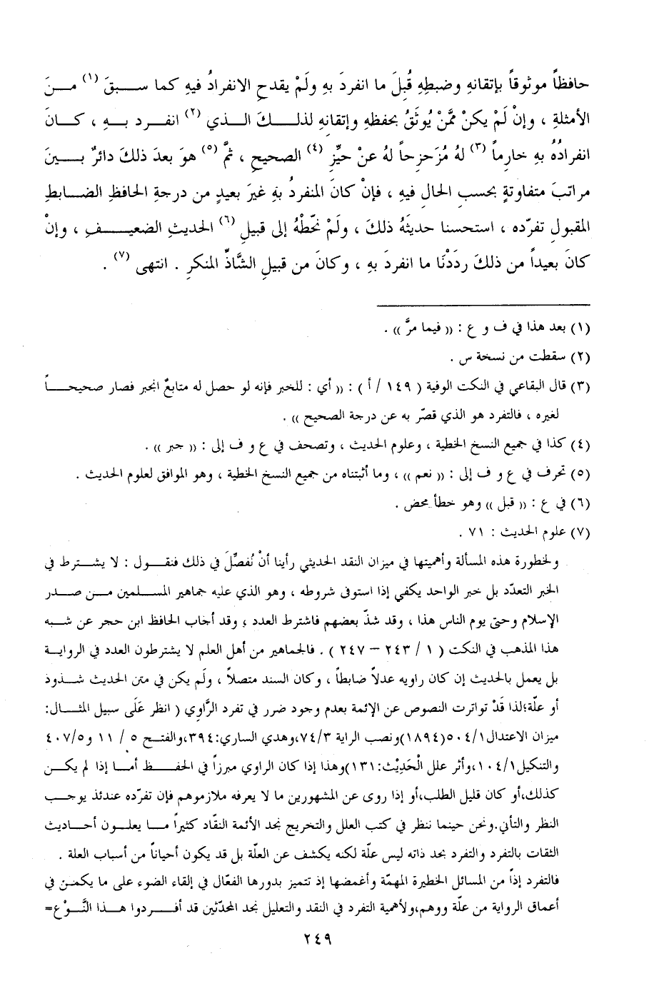 حافظاً موثوقاً بإتقانهِ وضبطِهِ قُبِلَ ما انفردَ بهِ ولَمْ يقدحِ الانفرادُ فيهِ كما سبقَ منَ الأمثلةِ، وإنْ لَمْ يكنْ ممَّنْ يُوثَقُ بحفظهِ وإتقانِهِ لذلكَ الذي انفرد بهِ، كانَ انفرادُهُ بهِ خارِماً لهُ مُزَحزِحاً لهُ عنْ حيِّزِ الصحيحِ، ثمَّ هوَ بعدَ ذلكَ دائرٌ بينَ مراتبَ متفاوتةٍ بحسبِ الحالِ فيهِ، فإنْ كانَ المنفردُ بهِ غيرَ بعيدٍ من درجةِ الحافظِ الضابطِ المقبولِ تفرّده، استحسنا حديثَهُ ذلكَ، ولَمْ نحّطْهُ إلى قبيلِ الحديثِ الضعيفِ، وإنْ كانَ بعيداً من ذلكَ ردَدْنَا ما انفردَ بهِ، وكانَ من قبيلِ الشَّاذِّ المنكرِ. انتهى.