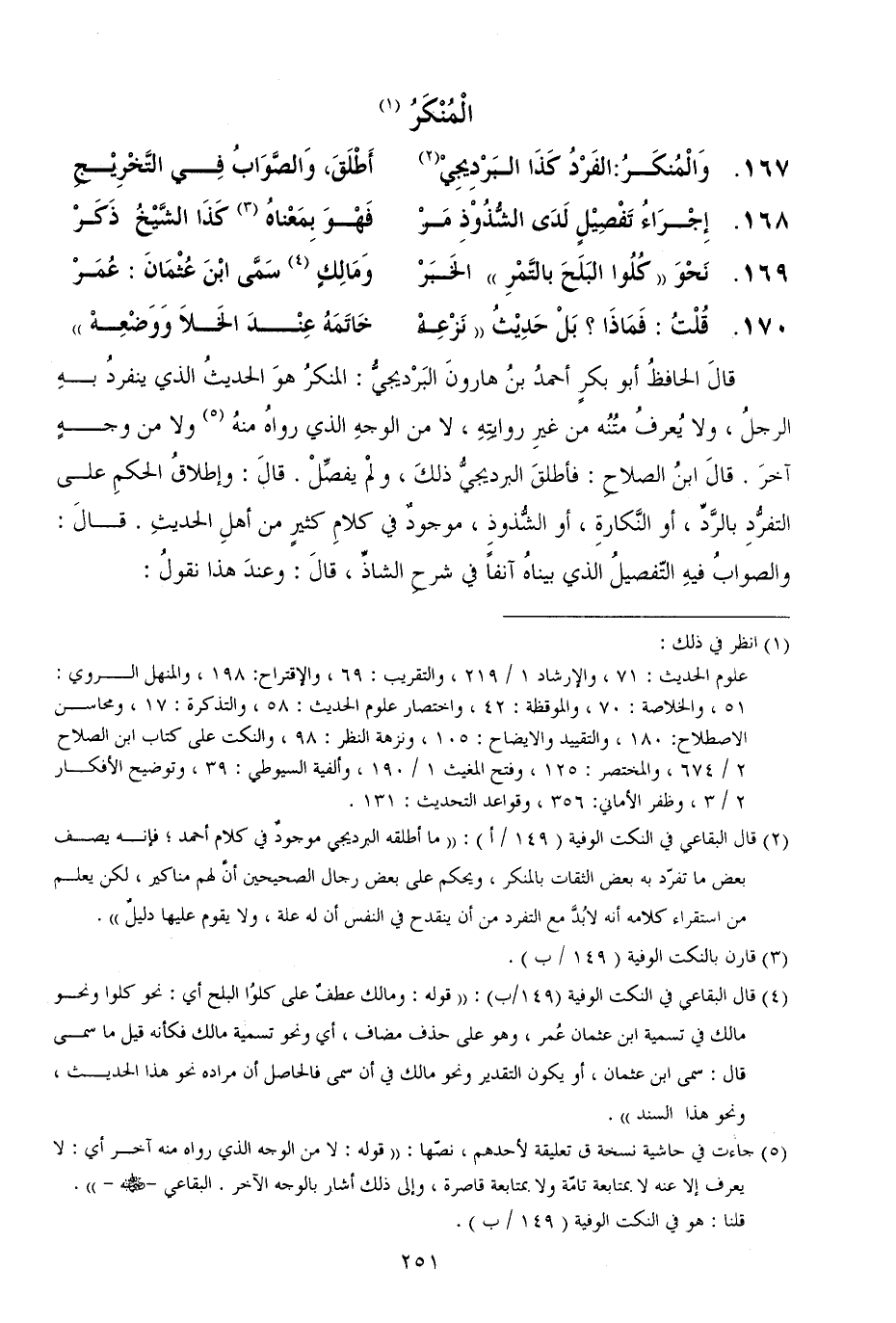 قالَ الحافظُ أبو بكرٍ أحمدُ بنُ هارونَ البَرْديجيُّ: المنكرُ هوَ الحديثُ الذي ينفردُ بهِ الرجلُ، ولا يُعرفُ متُنُه من غيرِ روايتِهِ، لا من الوجهِ الذي رواهُ منهُ ولا من وجهٍ آخرَ. قالَ ابنُ الصلاحِ: فأطلقَ البرديجيُّ ذلكَ، ولمْ يفصِّلْ. قالَ: وإطلاقُ الحكمِ على التفرُّدِ بالرَّدِّ، أو النَّكارةِ، أو الشُّذوذِ، موجودٌ في كلامِ كثيرٍ من أهلِ الحديثِ. قالَ: والصوابُ فيهِ التّفصيلُ الذي بيناهُ آنفاً في شرحِ الشاذِّ، قالَ: وعندَ هذا نقولُ:
