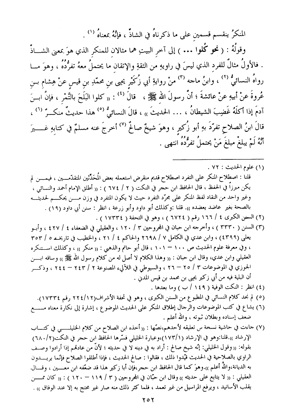 وقولُهُ: (نحو كُلوا ... ) إلى آخرِ البيتِ هما مثالانِ للمنكرِ الذي هوَ بمعنى الشاذِّ. فالأولُ مثالٌ للفردِ الذي ليسَ في راويهِ من الثقةِ والإتقانِ ما يحتملُ معهُ تفرُّدُهُ، وهوَ ما رواهُ النسائيُّ، وابنُ ماجه منْ روايةِ أبي زُكَيْرٍ يحيى بنِ محمّدِ بنِ قيسٍ عنْ هِشامِ بنِ عُروةَ عنْ أبيهِ عنْ عائشةَ؛ أنَّ رسولَ اللهِ - صَلَّى اللهُ عَلَيْهِ وَسَلَّمَ -، قالَ: ((كلوا البَلَحَ بالتَّمْرِ، فإنَّ ابنَ آدمَ إذا أكلَهُ غَضِبَ الشيطانُ، ... الحديثَ)) ، قالَ النسائيُّ هذا حديثٌ منكرٌ، قالَ ابنُ الصلاحِ تفرّدَ بهِ أبو زُكيرٍ، وهوَ شيخٌ صالحٌ أخرجَ عنه مسلمٌ في كتابِهِ غيرَ أنَّهُ لَمْ يبلغْ مبلغَ مَنْ يحتملُ تفرُّدُهُ انتهى.