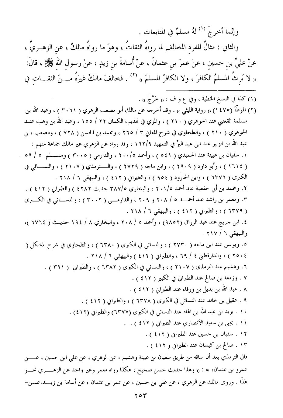 والثاني: مثالٌ للفردِ المخالفِ لما رواهُ الثقاتُ، وهوَ ما رواهُ مالكٌ، عنِ الزهريِّ، عنْ عليِّ بنِ حسينٍ، عنْ عمرَ بنِ عثمانَ، عنْ أُسامةَ بنِ زيدٍ، عنْ رسولِ اللهِ - صَلَّى اللهُ عَلَيْهِ وَسَلَّمَ -، قالَ: ((لا يَرِثُ المسلمُ الكافرَ، ولا الكافرُ المسلمَ)) . فخالفَ مالكٌ غيرَهُ منَ الثقاتِ في