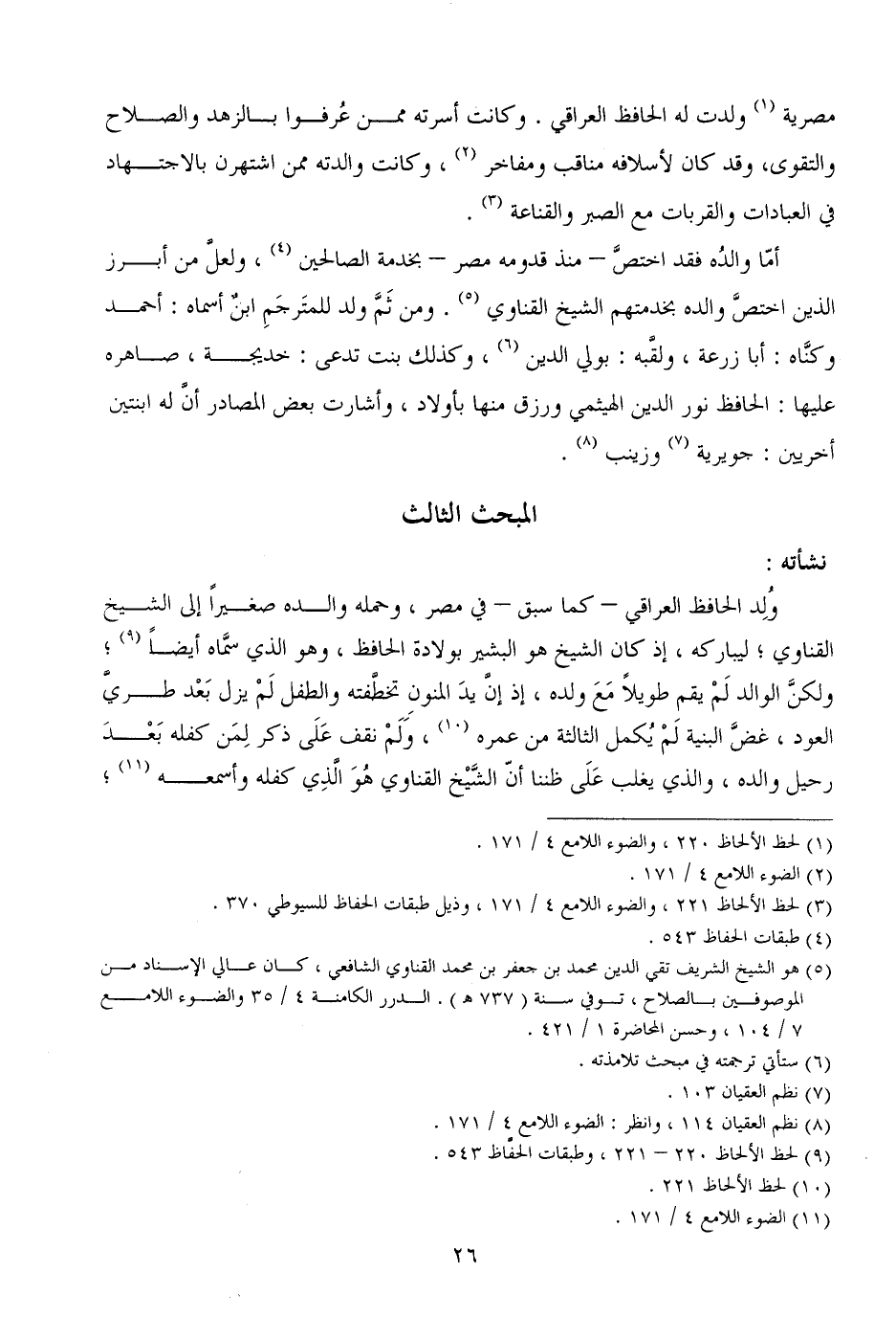 وُلِد الحافظ العراقي - كما سبق - في مصر، وحمله والده صغيراً إلى الشيخ القناوي؛ ليباركه، إذ كان الشيخ هو البشير بولادة الحافظ، وهو الذي سمَّاه أيضاً؛ ولكنَّ الوالد لَمْ يقم طويلاً مَعَ ولده، إذ إنَّ يدَ المنونِ تخطَّفته والطفل لَمْ يزل بَعْد طريَّ العود، غضَّ البنية لَمْ يُكمل الثالثة من عمره، وَلَمْ نقف عَلَى ذكر لِمَن كفله بَعْدَ رحيل والده، والذي يغلب عَلَى ظننا أنّ الشَّيْخ القناوي هُوَ الَّذِي كفله وأسمعه؛