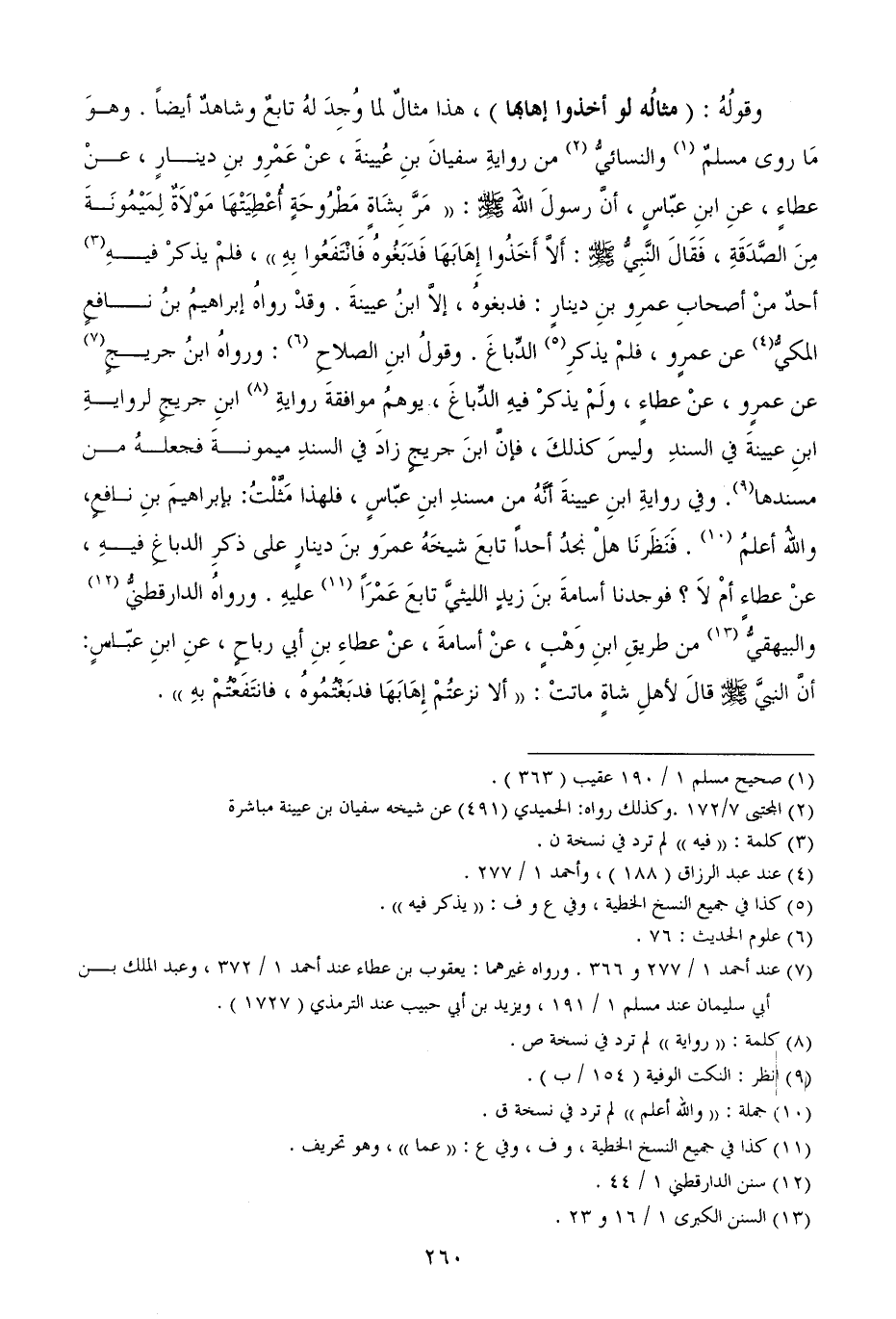 وقولُهُ: (مثالُه لو أخذوا إهابها) ، هذا مثالٌ لما وُجِدَ لهُ تابعٌ وشاهدٌ أيضاً. وهوَ مَا روى مسلمٌ والنسائيُّ من روايةِ سفيانَ بنِ عُيينةَ، عنْ عَمْرِو بنِ دينارٍ، عنْ عطاءٍ، عنِ ابنِ عبّاسٍ، أنَّ رسولَ اللهَ - صَلَّى اللهُ عَلَيْهِ وَسَلَّمَ -: ((مَرَّ بِشَاةٍ مَطْرُوحَةٍ أُعْطِيَتْهَا مَوْلاَةٌ لِمَيْمُونَةَ مِنَ الصَّدَقَةِ، فَقَالَ النَّبِيُّ - صَلَّى اللهُ عَلَيْهِ وَسَلَّمَ -: أَلاَّ أَخَذُوا إِهَابَهَا فَدَبَغُوهُ فَانْتَفَعُوا بِهِ)) ، فلمْ يذكرْ فيهِ أحدٌ منْ أصحابِ عمرِو بنِ دينارٍ: فدبغوهُ، إلاَّ ابنُ عيينةَ. وقدْ رواهُ إبراهيمُ بنُ نافعٍ المكيُّ عن عمرٍو، فلمْ يذكرِ الدِّباغَ. وقولُ ابنِ الصلاحِ: ورواهُ ابنُ جريجٍ عن عمرٍو، عنْ عطاءٍ، ولَمْ يذكرْ فيهِ الدِّباغَ، يوهمُ موافقةَ روايةِ ابنِ جريجٍ لروايةِ ابنِ عيينةَ في السندِ وليسَ كذلكَ، فإنَّ ابنَ جريجٍ زادَ في السندِ ميمونةَ فجعلهُ من مسندها. وفي روايةِ ابنِ عيينةَ أنَّهُ من مسندِ ابنِ عبّاسٍ، فلهذا مَثَّلْتُ: بإبراهيمَ بنِ نافعٍ، واللهُ أعلمُ. فَنَظَرنَا هلْ نجدُ أحداً تابعَ شيخَهُ عمرَو بنَ دينارٍ على ذكرِ الدباغِ فيهِ، عنْ عطاءٍ أمْ لاَ؟ فوجدنا أسامةَ بنَ زيدٍ الليثيَّ تابعَ عَمْرَاً عليهِ. ورواهُ الدارقطنيُّ والبيهقيُّ من طريقِ ابنِ وَهْبٍ، عنْ أسامةَ، عنْ عطاءِ بنِ أبي رباحٍ، عنِ ابنِ عبّاسٍ: أنَّ النبيَّ - صَلَّى اللهُ عَلَيْهِ وَسَلَّمَ - قالَ لأهلِ شاةٍ ماتتْ: ((ألا نزعتُمْ إِهَابَهَا فدبَغْتُمُوهُ، فانتَفَعْتُمْ بهِ)) .