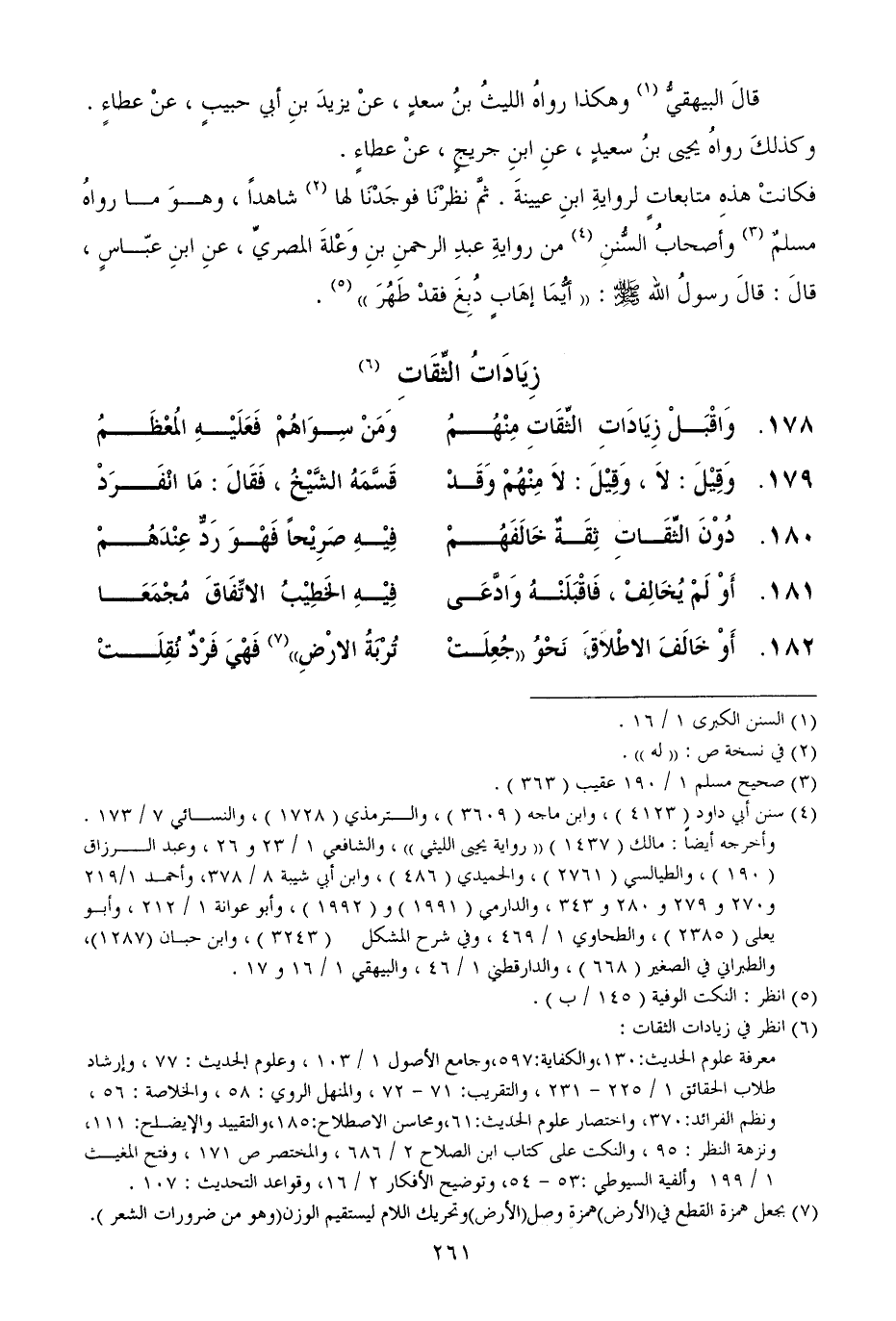 178.... وَاقْبَلْ زِيَادَاتِ الثِّقَاتِ مِنْهُمُ ... وَمَنْ سِوَاهُمْ فَعَلَيْهِ المُعْظَمُ