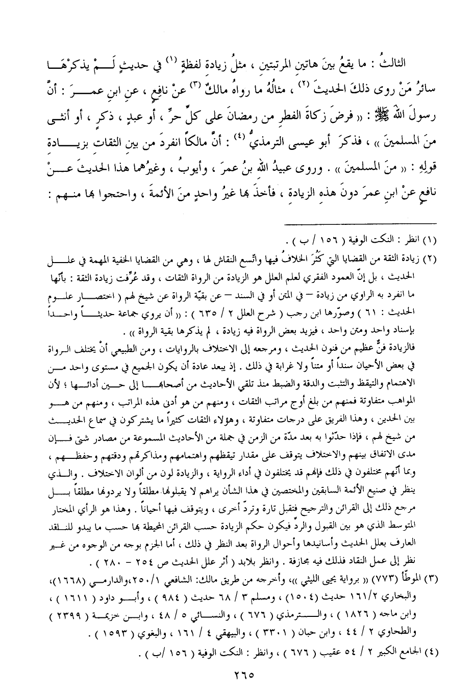 الثالثُ: ما يقعُ بينَ هاتينِ المرتبتينِ، مثلُ زيادةِ لفظةٍ في حديثٍ لَمْ يذكرْهَا سائرُ مَنْ روى ذلكَ الحديثَ، مثالُهُ ما رواهُ مالكٌ عنْ نافِعٍ، عنِ ابنِ عمرَ: أنَّ رسولَ اللهَ - صَلَّى اللهُ عَلَيْهِ وَسَلَّمَ -: ((فرضَ زكاةَ الفطرِ من رمضانَ على كلِّ حرِّ، أو عبدٍ، ذكرٍ، أو أنثى منَ المسلمينَ)) ، فذكرَ أبو عيسى الترمذيُّ: أنَّ مالكاً انفردَ من بينِ الثقاتِ بزيادةِ قولِهِ: ((منَ المسلمينَ)) . وروى عبيدُ اللهِ بنُ عمرَ، وأيوبُ، وغيرُهما هذا الحديثَ عنْ نافعٍ عنْ ابنِ عمرَ دونَ هذهِ الزيادةِ، فأخذَ بها غيرُ واحدٍ منَ الأئمةَ، واحتجوا بها منهم: