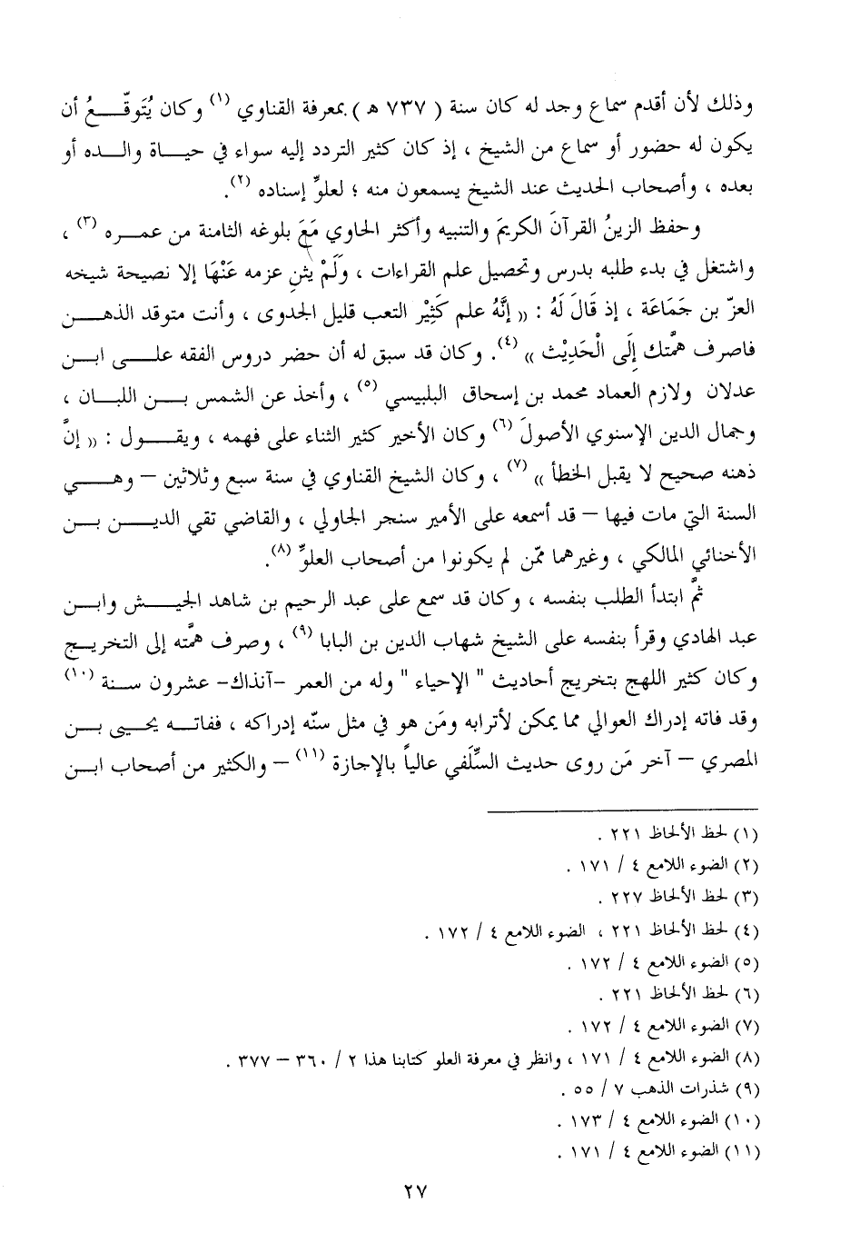 وذلك لأن أقدم سماع وجد له كان سنة (737 هـ) بمعرفة القناوي وكان يُتَوقّعُ أن يكون له حضور أو سماع من الشيخ، إذ كان كثير التردد إليه سواء في حياة والده أو بعده، وأصحاب الحديث عند الشيخ يسمعون منه؛ لعلوِّ إسناده.