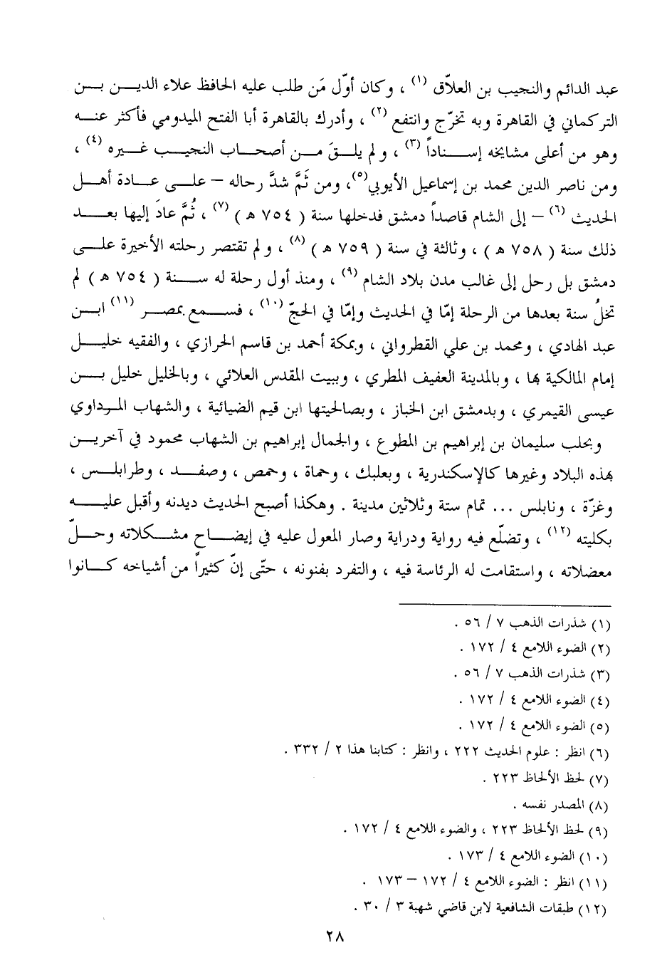 عبد الدائم والنجيب بن العلاّق، وكان أوّل مَن طلب عليه الحافظ علاء الدين بن التركماني في القاهرة وبه تخرّج وانتفع، وأدرك بالقاهرة أبا الفتح الميدومي فأكثر عنه وهو من أعلى مشايخه إسناداً، ولم يلقَ من أصحاب النجيب غيره، ومن ناصر الدين محمد بن إسماعيل الأيوبي، ومن ثَمَّ شدَّ رحاله - على عادة أهل الحديث - إلى الشام قاصداً دمشق فدخلها سنة (754 هـ) ، ثُمَّ عادَ إليها بعد ذلك سنة (758 هـ) ، وثالثة في سنة (759 هـ) ، ولم تقتصر رحلته الأخيرة على دمشق بل رحل إلى غالب مدن بلاد الشام، ومنذ أول رحلة له سنة (754 هـ) لم تخلُ سنة بعدها من الرحلة إمّا في الحديث وإمّا في الحجّ، فسمع بمصر ابن عبد الهادي، ومحمد بن علي القطرواني، وبمكة أحمد بن قاسم الحرازي، والفقيه خليل إمام المالكية بها، وبالمدينة العفيف المطري، وببيت المقدس العلائي، وبالخليل خليل بن عيسى القيمري، وبدمشق ابن الخباز، وبصالحيتها ابن قيم الضيائية، والشهاب المرداوي، وبحلب سليمان بن إبراهيم بن المطوع، والجمال إبراهيم بن الشهاب محمود في آخرين بهذه البلاد وغيرها كالإسكندرية، وبعلبك، وحماة، وحمص، وصفد، وطرابلس، وغزّة، ونابلس ... تمام ستة وثلاثين مدينة.