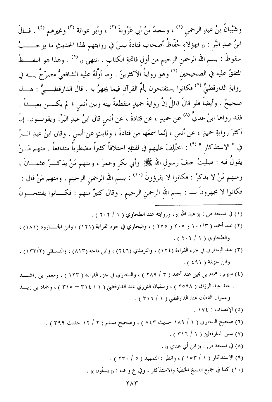 قالَ ابنُ عبدِ البَّرِ: ((فهؤلاءِ حُفّاظُ أصحاب قتادةَ ليسَ في روايتهم لهذا الحديثِ ما يوجبُ سقوطَ: بسمِ اللهِ الرحمنِ الرحيمِ من أولِ فاتحةِ الكتابِ. انتهى)) . وهذا هو اللفظُ المتفقُ عليه في الصحيحينِ وهو روايةُ الأكثرينَ. وما أوَّلهُ عليه الشافعيُّ مصرّحٌ به في روايةِ الدارقطنيِّ فكانوا يستفتحون بأمِّ القرآنِ فيما يجهرُ به. قال الدارقطنيُّ: هذا صحيحٌ. وأيضاً فلو قالَ قائلٌ إنَّ روايةَ حميدٍ منقطعةٌ بينه وبين أنسٍ؛ لم يكن بعيداً. فقد رواها ابنُ عديٍّ عن حميدٍ، عن قتادةَ، عن أنسٍ قال ابنُ عبدِ البَرِّ: ويقولون: إنَّ أكثرَ روايةِ حميدٍ، عن أنسٍ، إنّما سمعَها من قتادةَ، وثابتٍ عن أنسٍ. وقال ابنُ عبدِ البرِّ في " الاستذكارِ ": اختُلِفَ عليهم في لفظِهِ اختلافاً كثيراً مضطرباً متدافعاً. منهم مَنْ يقولُ فيه: صليتُ خلفَ رسولِ اللهِ (وأبي بكرٍ وعمرَ، ومنهم مَنْ يذكرُ عثمانَ، ومنهم مَنْ لا يذكرُ: فكانوا لا يقرؤونَ: بسمِ اللهِ الرحمنِ الرحيمِ. ومنهم مَنْ قال: فكانوا لا يجهرونَ بـ: بسمِ اللهِ الرحمنِ الرحيمِ. وقال كثيرٌ منهم: فكانوا يفتتحونَ