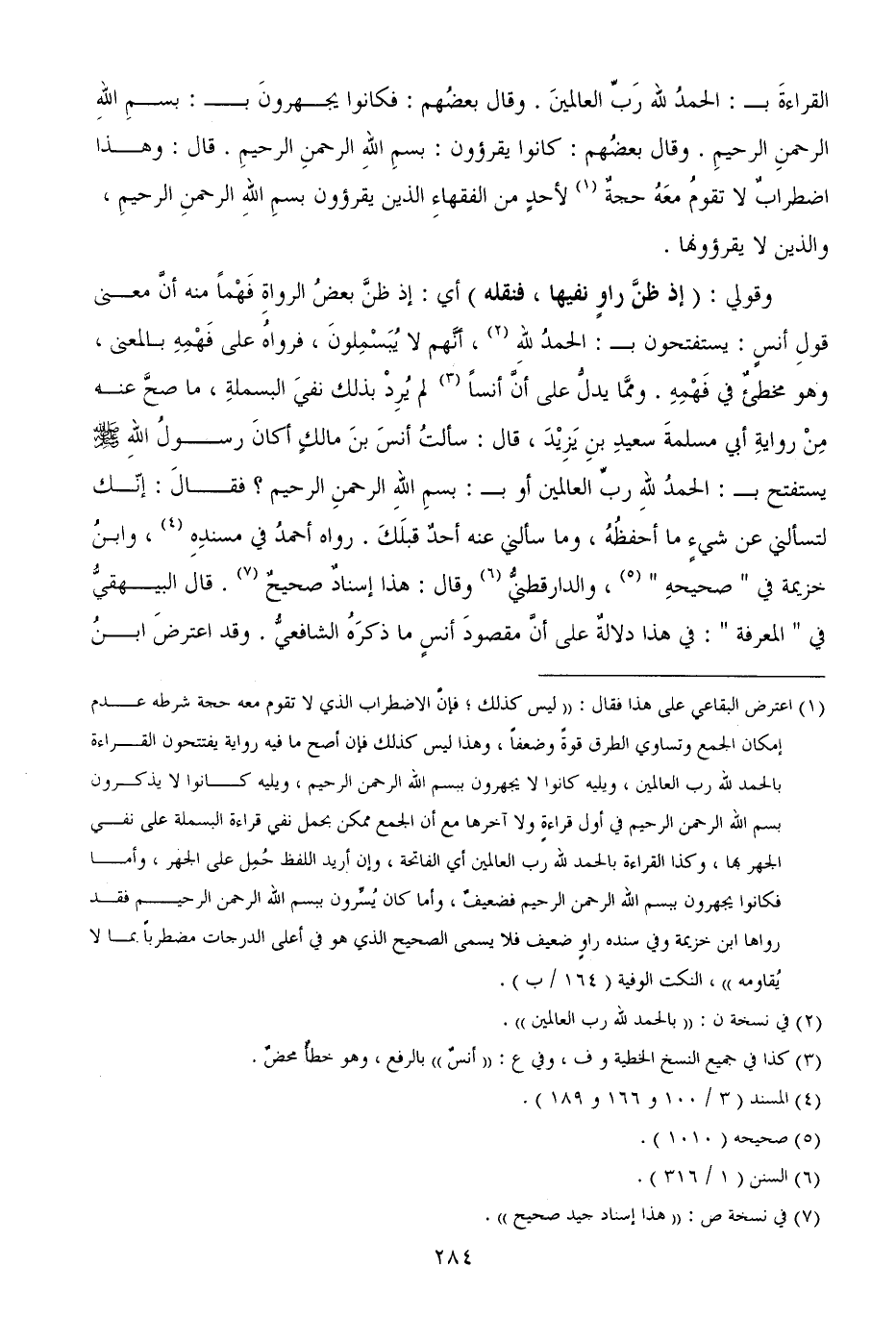 وقولي: (إذ ظنَّ راوٍ نفيها، فنقله) أي: إذ ظنَّ بعضُ الرواةِ فَهْماً منه أنَّ معنى قولِ أنسٍ: يستفتحون بـ: الحمدُ للهِ، أنَّهم لا يُبَسْمِلونَ، فرواهُ على فَهْمِهِ بالمعنى، وهو مخطئٌ في فَهْمِهِ. وممَّا يدلُّ على أنَّ أنساً لم يُرِدْ بذلك نفيَ البسملةِ، ما صحَّ عنه مِنْ روايةِ أبي مسلمةَ سعيدِ بنِ يَزِيْدَ، قال: سألتُ أنسَ بنَ مالكٍ أكانَ رسولُ اللهِ (يستفتح بـ: الحمدُ للهِ ربِّ العالمين أو بـ: بسمِ اللهِ الرحمنِ الرحيم؟ فقالَ: إنّك لتسألني عن شيءٍ ما أحفظُهُ، وما سألني عنه أحدٌ قبلَكَ. رواه أحمدُ في مسندِهِ، وابنُ خزيمة في " صحيحهِ "، والدارقطنيُّ وقال: هذا إسنادٌ صحيحٌ. قال البيهقيُّ في " المعرفة ": في هذا دلالةٌ على أنَّ مقصودَ أنسٍ ما ذكرَهُ الشافعيُّ. وقد اعترضَ ابنُ