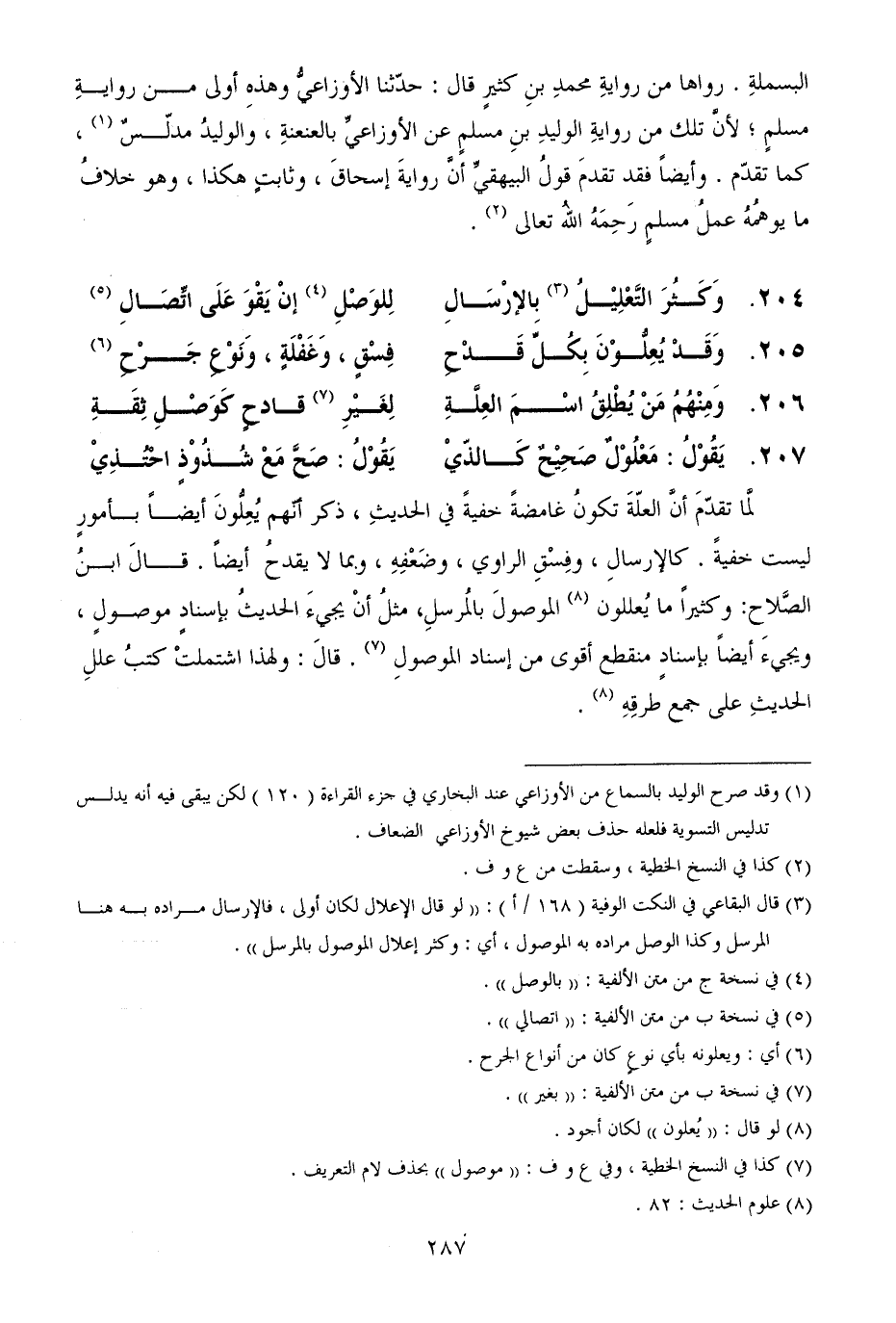 البسملةِ. رواها من روايةِ محمدِ بنِ كثيرٍ قال: حدّثنا الأوزاعيُّ وهذهِ أولى من روايةِ مسلمٍ؛ لأنَّ تلك من روايةِ الوليدِ بنِ مسلمٍ عن الأوزاعيِّ بالعنعنةِ، والوليدُ مدلّسٌ، كما تقدّم. وأيضاً فقد تقدمَ قولُ البيهقيِّ أنَّ روايةَ إسحاقَ، وثابتٍ هكذا، وهو خلافُ ما يوهمُهُ عملُ مسلمٍ رَحِمَهُ اللهُ تعالى.