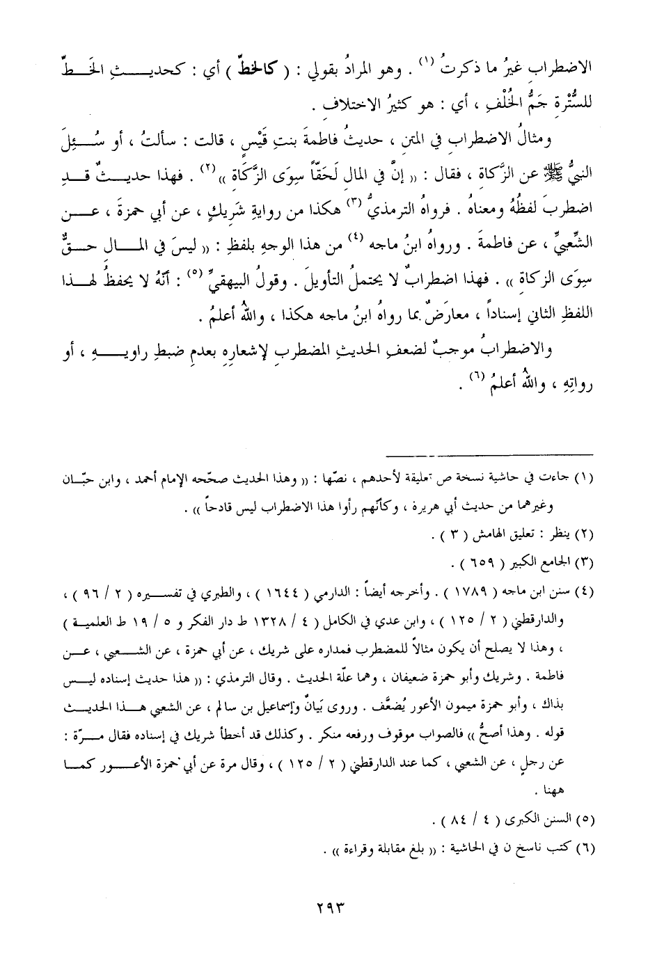 ومثالُ الاضطرابِ في المتنِ، حديثُ فاطمةَ بنتِ قَيْسٍ، قالت سألتُ، أو سُئِلَ النبيُّ - صَلَّى اللهُ عَلَيْهِ وَسَلَّمَ - عن الزَّكاةِ، فقال إنَّ في المالِ لَحَقّاً سِوَى الزَّكَاةِ فهذا حديثٌ قدِ اضطربَ لفظُهُ ومعناهُ فرواهُ الترمذيُّ هكذا من روايةِ شَرِيكٍ، عن أبي حمزةَ، عن الشِّعبيِّ، عن فاطمةَ ورواهُ ابنُ ماجه من هذا الوجهِ بلفظِ ليسَ في المالِ حقٌّ سِوَى الزكاةِ فهذا اضطرابٌ لا يحتملُ التأويلَ وقولُ البيهقيِّ أنّهُ لا يحفظُ لهذا اللفظِ الثاني إسناداً، معارَضٌ بما رواهُ ابنُ ماجه هكذا، واللهُ أعلمُ