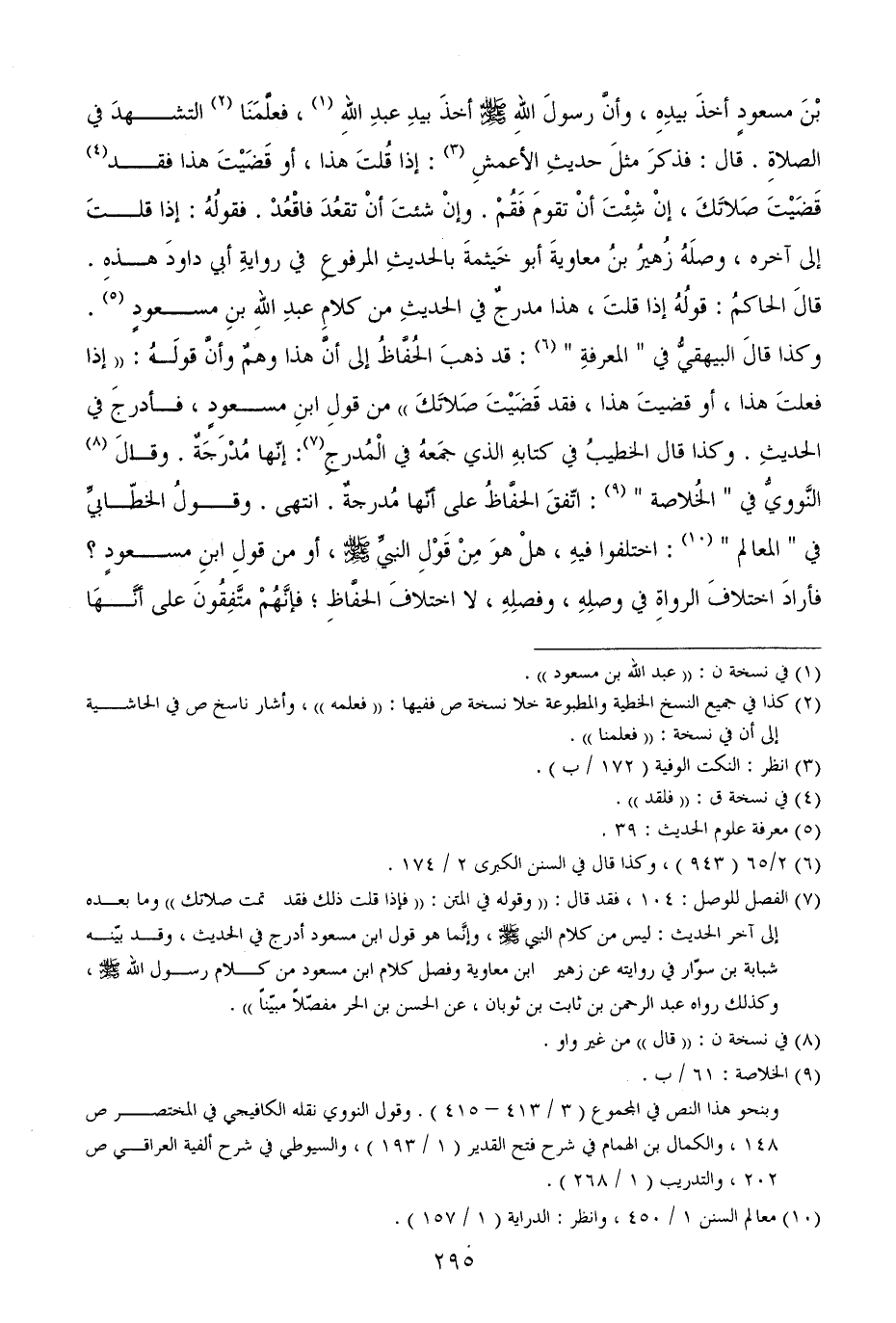 بْنَ مسعودٍ أخذَ بيدِهِ، وأنَّ رسولَ اللهِ - صَلَّى اللهُ عَلَيْهِ وَسَلَّمَ - أخذَ بيدِ عبدِ اللهِ، فعلَّمَنَا التشهدَ في الصلاةِ. قال: فذكرَ مثلَ حديثِ الأعمشِ: إذا قُلتَ هذا، أو قَضَيْتَ هذا فقد قَضَيْتَ صَلاتَكَ، إنْ شِئْتَ أنْ تقومَ فَقُمْ. وإنْ شئتَ أنْ تقعُدَ فاقْعُدْ. فقولُهُ: إذا قلتَ إلى آخره، وصلَهُ زُهيرُ بنُ معاويةَ أبو خَيثمةَ بالحديثِ المرفوعِ في روايةِ أبي داودَ هذهِ. قالَ الحاكمُ: قولُهُ إذا قلتَ، هذا مدرجٌ في الحديثِ من كلامِ عبدِ اللهِ بنِ مسعودٍ. وكذا قالَ البيهقيُّ في " المعرفةِ ": قد ذهبَ الحُفَّاظُ إلى أنَّ هذا وهمٌ وأنَّ قولَهُ: ((إذا فعلتَ هذا، أو قضيتَ هذا، فقد قَضَيْتَ صَلاتَكَ)) من قولِ ابنِ مسعودٍ، فأدرجَ في الحديثِ. وكذا قال الخطيبُ في كتابهِ الذي جمَعهُ في الْمُدرجِ: إنّها مُدْرَجَةٌ. وقالَ النَّوويُّ في " الخُلاصة ": اتّفقَ الحفَّاظُ على أنّها مُدرجةٌ. انتهى. وقولُ الخطّابيِّ في " المعالم ": اختلفوا فيهِ، هلْ هوَ مِنْ قَوْلِ النبيِّ - صَلَّى اللهُ عَلَيْهِ وَسَلَّمَ -، أو من قولِ ابنِ مسعودٍ؟ فأرادَ اختلافَ الرواةِ في وصلِهِ، وفصلِهِ، لا اختلافَ الحفَّاظِ؛ فإنَّهُمْ متَّفِقُونَ على أنَّهَا
