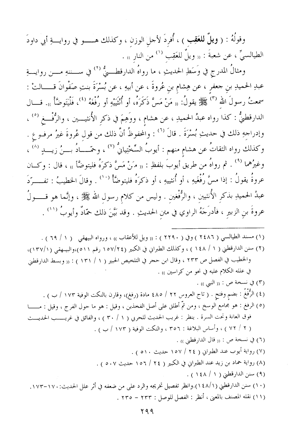 ومثالُ المدرجِ في وَسَطِ الحديثِ، ما رواهُ الدارقطنيُّ في سننهِ من روايةِ عبدِ الحميدِ بنِ جعفرٍ، عن هِشامِ بنِ عُروةَ، عن أبيهِ، عن بُسْرَةَ بنتِ صَفْوانَ قالتْ: سمعتُ رسولَ اللهِ - صَلَّى اللهُ عَلَيْهِ وَسَلَّمَ - يقولُ: ((مَنْ مَسَّ ذَكَرَهُ، أو أُنْثَيَيْهِ أو رُفْغَهُ، فَلْيَتَوضَّأْ)) . قال الدارقطنيُّ: كذا رواه عبدُ الحميدِ، عن هشامٍ، ووَهِمَ في ذكرِ الأُنثيين، والرُّفْغِ، وإدراجِهِ ذلك في حديثِ بُسْرَةَ. قالَ: والمحفوظُ أنَّ ذلك من قولِ عُروةَ غيرُ مرفوعٍ. وكذلك رواه الثقاتُ عن هشامٍ منهم: أيوبُ السِّخْتِيانيُّ، وحمّادُ بنُ زيدٍ، وغيرُهما. ثم رواهُ من طريق أيوبَ بلفظِ: ((مَنْ مَسَّ ذكرَهُ فليتوضَّأ)) ، قال: وكان عروةُ يقولُ: إذا مسَّ رُفْغَيهِ، أو أُنثييهِ، أو ذكرَهُ فليتوضَّأْ. وقالَ الخطيبُ: تفرّدَ عبدُ الحميدِ بذكرِ الأُنثيينِ، والرُّفْغينِ. وليس من كلامِ رسولِ الله - صَلَّى اللهُ عَلَيْهِ وَسَلَّمَ -، وإنَّما هو قولُ عروةَ بنِ الزبيرِ، فأدرَجَهُ الراوي في متنِ الحديثِ. وقد بَيَّنَ ذلك حمّادٌ وأيوبُ.