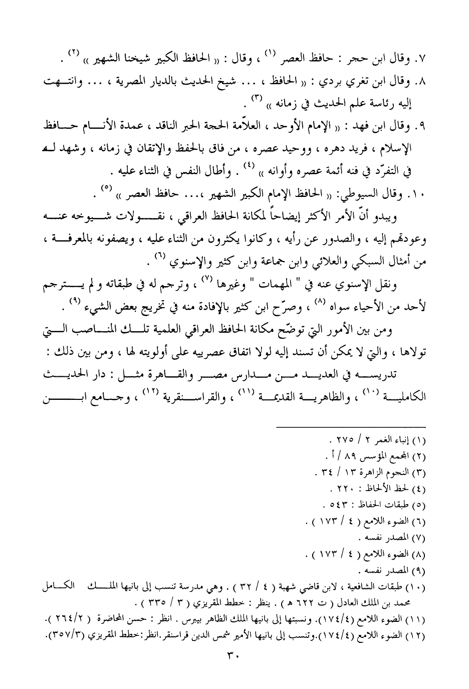 8. وقال ابن تغري بردي: ((الحافظ، ... شيخ الحديث بالديار المصرية، ... وانتهت إليه رئاسة علم الحديث في زمانه)) .