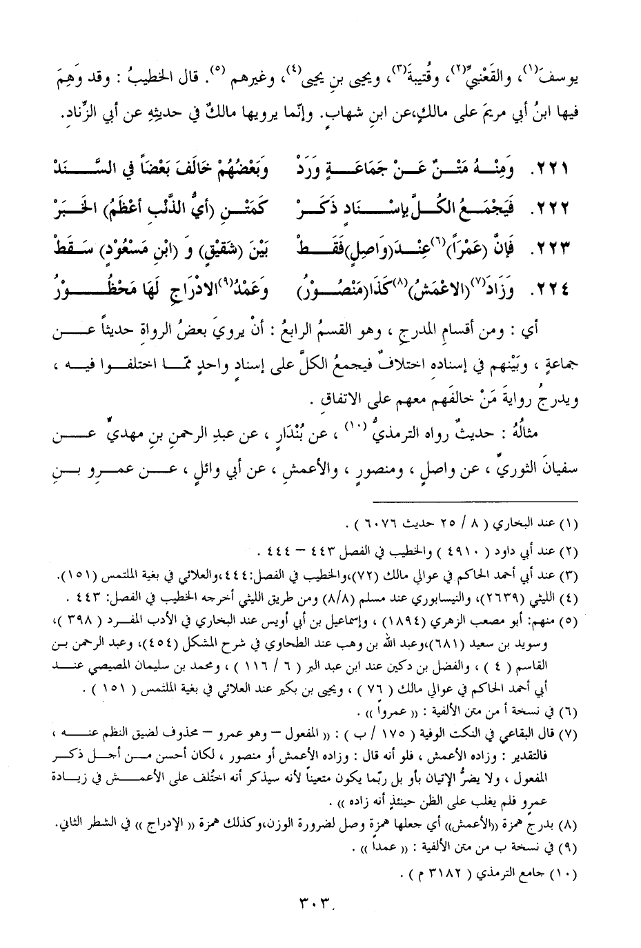 مثالُهُ: حديثٌ رواه الترمذيُّ، عن بُنْدَارٍ، عن عبدِ الرحمنِ بنِ مهديٍّ عن سفيانَ الثوريِّ، عن واصلٍ، ومنصورٍ، والأعمشِ، عن أبي وائلٍ، عن عمرِو بنِ