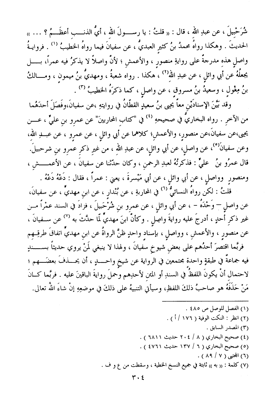 شُرَحْبِيلَ، عن عبدِ اللهِ، قال: ((قلتُ: يا رسولَ اللهِ، أيُّ الذنبِ أعظَمُ؟ ... )) الحديثَ. وهكذا رواهُ محمدُ بنُ كثيرٍ العبديُّ، عن سفيانَ فيما رواهُ الخطيبُ. فروايةُ واصلٍ هذهِ مدرجةٌ على روايةِ منصورٍ، والأعمشِ؛ لأنَّ واصلاً لا يذكرُ فيه عمراً، بل يجعلُهُ عن أبي وائلٍ، عن عبدِ اللهِ، هكذا. رواه شعبةُ، ومهديُّ بنُ ميمونٍ، ومالكُ بنُ مِغْولٍ، وسعيدُ بنُ مسروقٍ، عن واصلٍ، كما ذكرَهُ الخطيبُ.