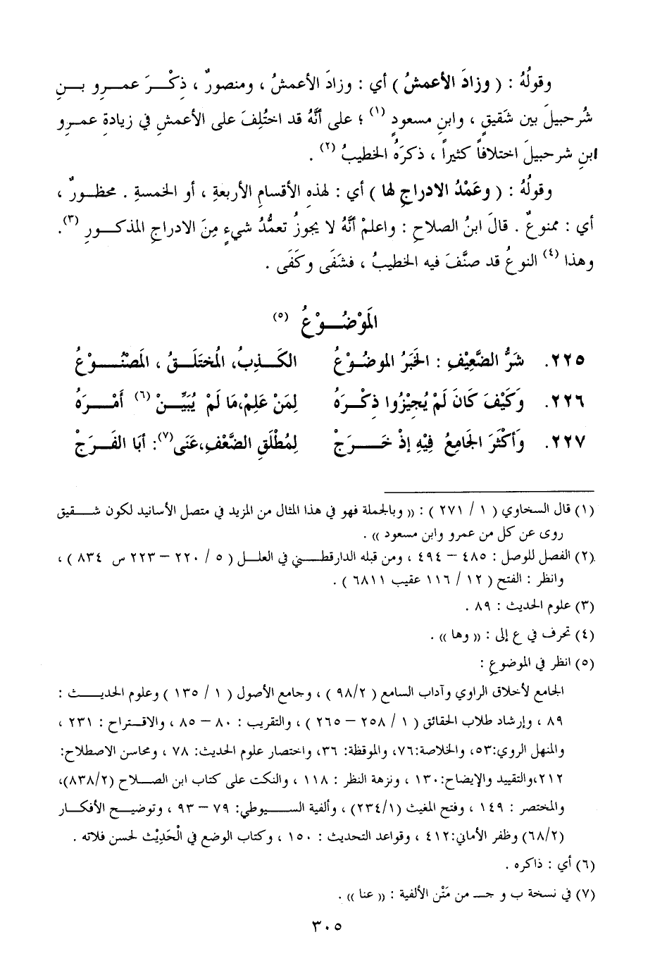 وقولُهُ: (وعَمْدُ الادراجِ لها) أي: لهذهِ الأقسامِ الأربعةِ، أو الخمسةِ. محظورٌ، أي: ممنوعٌ. قالَ ابنُ الصلاحِ: واعلمْ أنَّهُ لا يجوزُ تعمُّدُ شيءٍ مِنَ الادراجِ المذكورِ. وهذا النوعُ قد صنَّفَ فيه الخطيبُ، فشَفَى وكَفَى.
