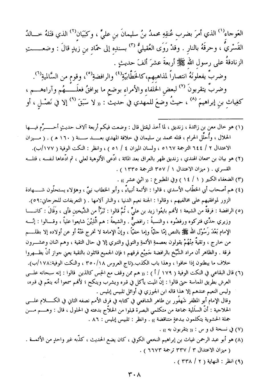 العَوجاءِ الذي أمرَ بضربِ عُنقِهِ محمدُ بنُ سليمانَ بنِ عليِّ، وكبَيَانٍ الذي قتَلهُ خالدُ القَسْريُّ، وحرقَهُ بالنارِ. وقدْ رَوَى العُقيليُّ بسندِهِ إلى حمّادِ بنِ زيدٍ قالَ: وضعتِ الزنادقةُ على رسولِ اللهِ (أربعةَ عشرَ ألفَ حديثٍ.