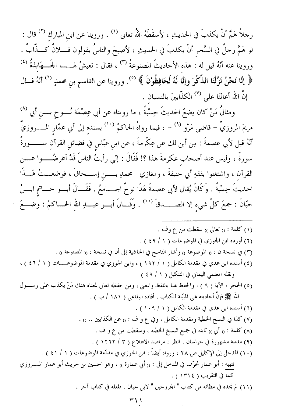 رجلاً هَمَّ أنْ يكذبَ في الحديثِ، لأسقَطَهُ اللهُ تعالى. وروينا عن ابنِ المباركِ قال: لو هَمَّ رجلٌ في السَّحرِ أنْ يكذبَ في الحديثِ، لأصبحَ والناسُ يقولون فلانٌ كذّابٌ. وروينا عنه أنّهُ قيل له: هذهِ الأحاديثُ المصنوعةُ، فقال: تعيشُ لها الجَهَابِذةُ (إنَّا نَحْنُ نَزَّلْنَا الذِّكْرَ وإنَّا لَهُ لَحَافِظُوْنَ (. وروينا عن القاسمِ بنِ محمدٍ أنّهُ قال: إنَّ الله أعانَنَا على الكذّابينَ بالنسيانِ.