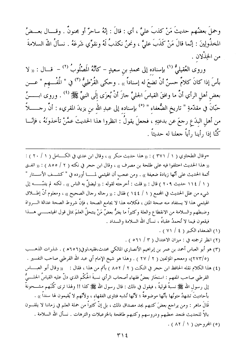وروى العُقيليُّ بإسنادِهِ إلى محمدِ بنِ سعيدٍ - كأنَّهُ المَصْلُوبُ - قال: ((لا بأسَ إذا كانَ كلامٌ حسنٌ أنْ تضعَ له إسناداً)) . وحكى القُرْطبيُّ في " المُفْهِم " عن بعضِ أهلِ الرأي أنَّ ما وافقَ القياسَ الجليَّ جازَ أنْ يُعزَى إِلَى النبيِّ (. وروى ابنُ حبّانَ في مقدّمةِ " تاريخِ الضُّعفاءِ " بإسنادِهِ إلى عبدِ اللهِ بنِ يزيدَ المقريء: أنَّ رجلاً من أهلِ البِدَعِ رجعَ عن بدعتِهِ، فجعلَ يقولُ: انظروا هذا الحديثَ عمَّنْ تأخذونَهُ، فإنّا كُنَّا إذا رأينا رأياً جعلنا له حديثاً.