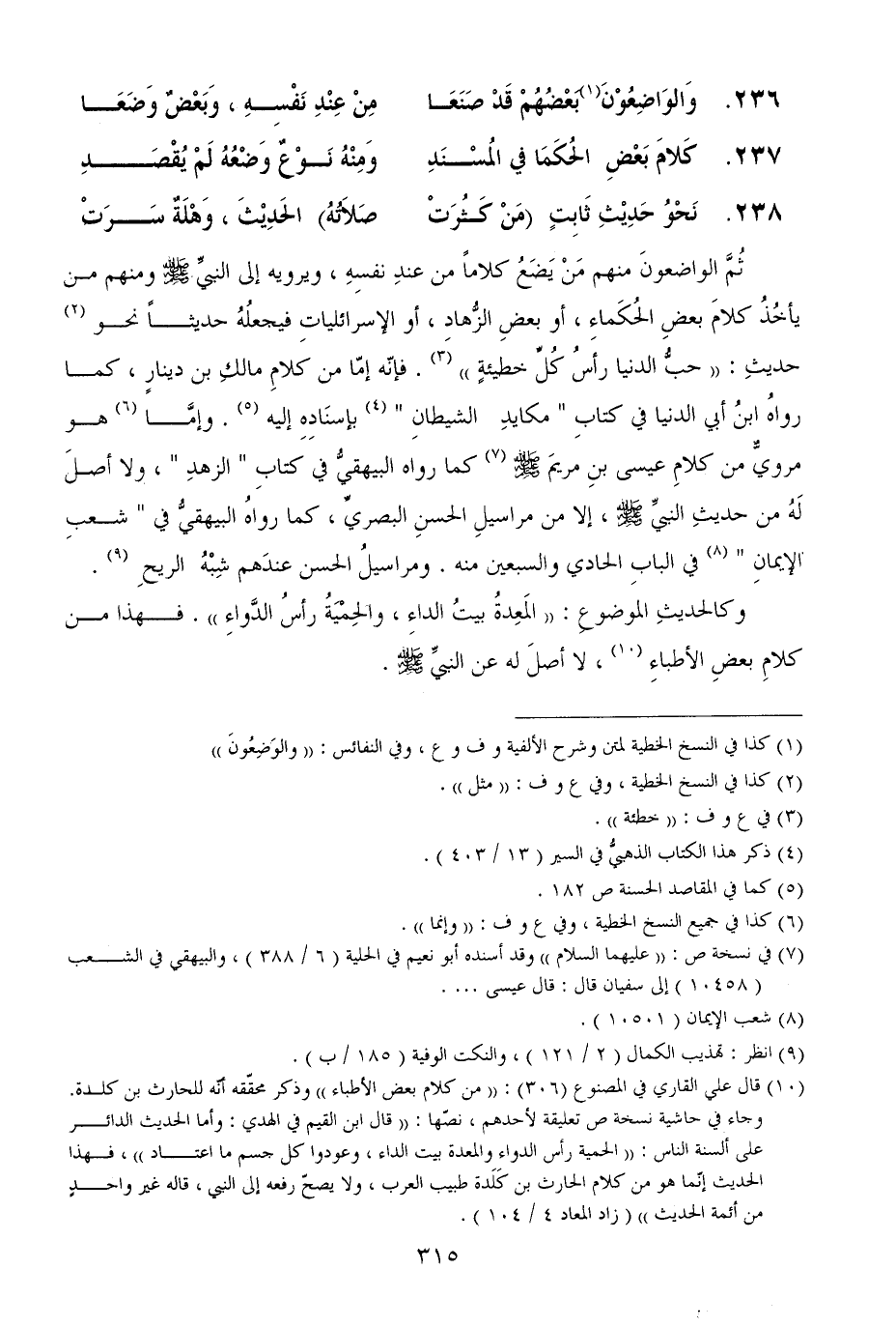 ثُمَّ الواضعونَ منهم مَنْ يَضَعُ كلاماً من عندِ نفسِهِ، ويرويه إلى النبيِّ (ومنهم من يأخُذُ كلامَ بعضِ الحُكَماءِ، أو بعضِ الزُّهادِ، أو الإسرائلياتِ فيجعلُهُ حديثاً نحو حديثِ: ((حبُّ الدنيا رأسُ كُلِّ خطيئةٍ)) . فإنّه إمّا من كلامِ مالكِ بن دينارٍ، كما رواهُ ابنُ أبي الدنيا في كتابِ " مكايدِ الشيطانِ " بإسنَادِهِ إليه. وإمَّا هو مرويٌّ من كلامِ عيسى بنِ مريمَ (كما رواه البيهقيُّ في كتابِ " الزهدِ "، ولا أصلَ لَهُ من حديثِ النبيِّ (، إلا من مراسيلِ الحسنِ البصريِّ، كما رواهُ البيهقيُّ في " شعبِ الإيمانِ " في البابِ الحادي والسبعين منه. ومراسيلُ الحسن عندَهم شِبْهُ الريحِ.