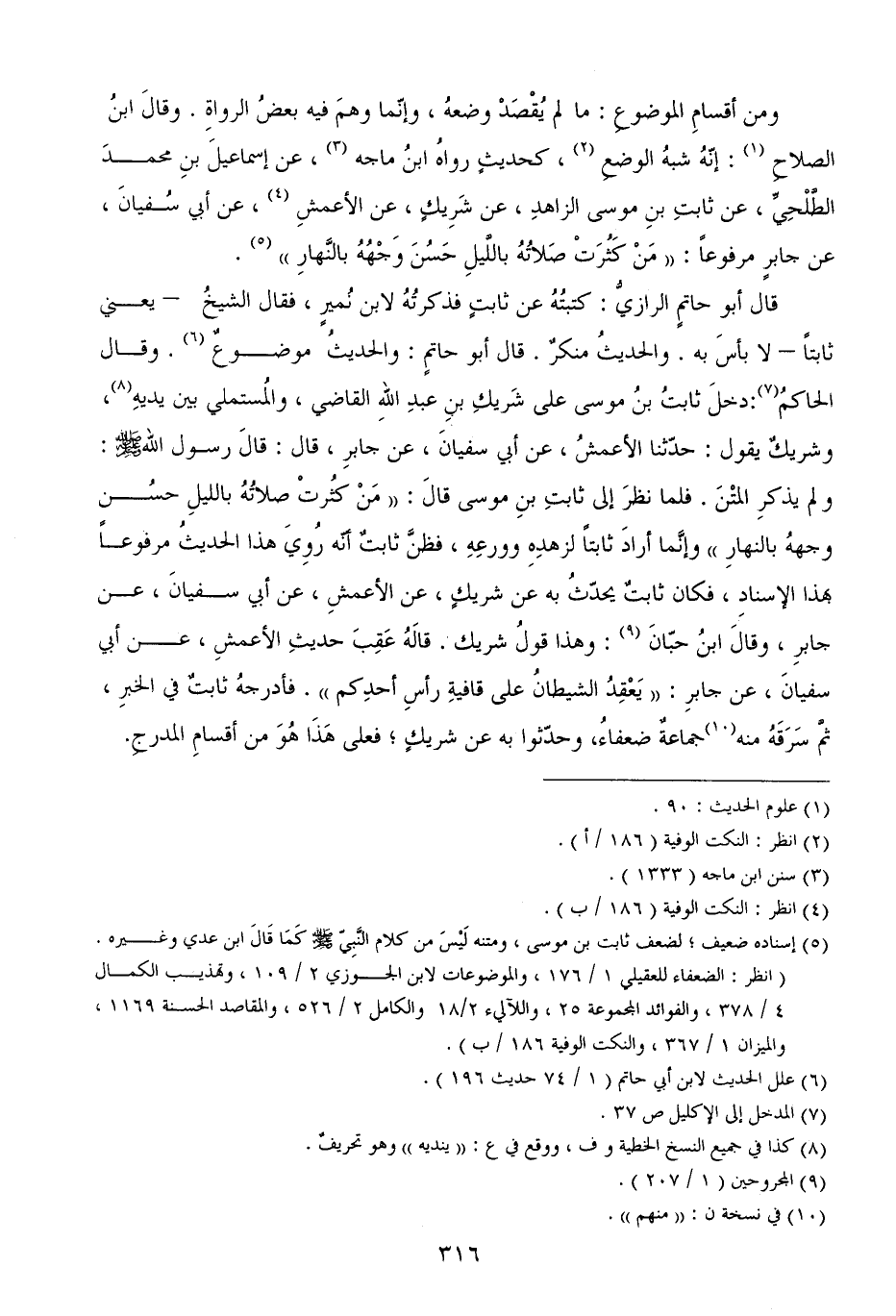 قال أبو حاتمٍ الرازيُّ: كتبتُهُ عن ثابتٍ فذكرتُهُ لابن نُميرٍ، فقال الشيخُ - يعني ثابتاً - لا بأسَ به. والحديثُ منكرٌ. قال أبو حاتمٍ: والحديثُ موضوعٌ. وقال الحاكمُ: دخلَ ثابتُ بنُ موسى على شَريكِ بنِ عبدِ اللهِ القاضي، والمُستملي بين يديهِ، وشريكٌ يقول: حدّثنا الأعمشُ، عن أبي سفيانَ، عن جابرِ، قال: قالَ رسول الله (: ولم يذكرِ المتْنَ. فلما نظرَ إلى ثابتِ بنِ موسى قالَ: ((مَنْ كثُرتْ صلاتُهُ بالليلِ حسُن وجههُ بالنهارِ)) وإنَّما أرادَ ثابتاً لزهدِهِ وورعِهِ، فظنَّ ثابتٌ أنّه رُوِيَ هذا الحديثُ مرفوعاً بهذا الإسنادِ، فكان ثابتٌ يحدّثُ به عن شريكٍ، عن الأعمشِ، عن أبي سفيانَ، عن جابرِ، وقالَ ابنُ حبّانَ: وهذا قولُ شريك. قالَهُ عَقِبَ حديثِ الأعمشِ، عن أبي سفيانَ، عن جابرِ: ((يَعْقِدُ الشيطانُ على قافيةِ رأسِ أحدِكم)) . فأدرجهُ ثابتٌ في الخبرِ، ثمَّ سَرَقَهُ منهجماعةٌ ضعفاءُ، وحدّثوا به عن شريكٍ؛ فعلى هَذَا هُوَ من أقسامِ المدرجِ.