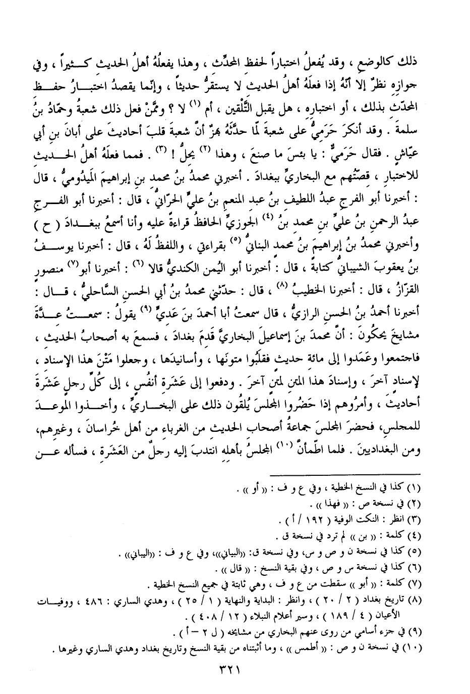 ذلك كالوضعِ، وقد يُفعلُ اختباراً لحفظِ المحدِّثِ، وهذا يفعلُهُ أهلُ الحديثِ كثيراً، وفي جوازِهِ نظرٌ إلا أنّهُ إذا فعلَهُ أهلُ الحديثِ لا يستقرُّ حديثاً، وإنّما يقصدُ اختبارُ حفظِ المحدّثِ بذلك، أو اختبارِهِ، هل يقبل التَّلْقين، أم لا؟ وممَّنْ فعل ذلك شعبةُ وحمّادُ بنُ سلمةَ. وقد أنكرَ حَرَمِيُّ على شعبةَ لمّا حدَّثَهُ بهزٌ أنَّ شعبةَ قلبَ أحاديثَ على أبانَ بنِ أبي عيّاشٍ. فقال حَرَميٌّ: يا بئسَ ما صنعَ، وهذا يحِلُّ!. فمما فعلَهُ أهلُ الحديثِ للاختبارِ، قِصّتُهم مع البخاريِّ ببغدادَ. أخبرني محمدُ بنُ محمدِ بنِ إبراهيمَ المَيدُوميُّ، قال: أخبرنا أبو الفرجِ عبدُ اللطيفِ بنُ عبدِ المنعمِ بنُ عليٍّ الحرّانيُّ، قال: أخبرنا أبو الفرجِ عبدُ الرحمنِ بنُ عليِّ بنِ محمدِ بنُ الجوزيِّ الحافظُ قراءةً عليه وأنا أسمعُ ببغدادَ (ح) وأخبرني محمدُ بنُ إبراهيمَ بنُ محمدٍ البنانيُّ بقراءتي، واللفظُ لَهُ، قال: أخبرنا يوسفُ بنُ يعقوبَ الشيبانيُّ كتابةً، قال: أخبرنا أبو اليُمن الكنديُّ قالا: أخبرنا أبو منصورٍ القزّازُ، قال: أخبرنا الخطيبُ، قال: حدّثني محمدُ بنُ أبي الحسنِ السَّاحليُّ، قال: أخبرنا أحمدُ بنُ الحسنِ الرازيُّ، قال سمعتُ أبا أحمدَ بنَ عَدِيٍّ يقولُ: سمعتُ عِدَّةَ مشايخَ يحكُونَ: أنَّ محمدَ بنَ إسماعيلَ البخاريَّ قَدِمَ بغدادَ، فسمعَ به أصحابُ الحديثِ، فاجتمعوا وعَمَدوا إلى مائةِ حديثٍ فقلَبُوا متونَها، وأسانيدَها، وجعلوا مَتْنَ هذا الإسنادِ، لإسنادٍ آخرَ، وإسنادَ هذا المتنِ لمتنٍ آخرَ. ودفعوا إلى عَشَرةِ أنفُسٍ، إلى كُلِّ رجلٍ عَشَرةَ أحاديثَ، وأمرُوهم إذا حَضُروا المجلسَ يُلقُون ذلك على البخاريِّ، وأخذوا الموعدَ للمجلسِ، فحضرَ المجلسَ جماعةُ أصحابِ الحديثِ من الغرباءِ من أهل خُراسانَ، وغيرِهم، ومن البغداديينَ.