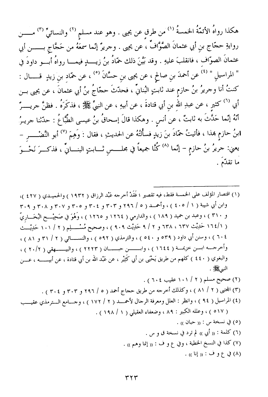 هكذا رواهُ الأئمّةُ الخمسةُ من طرقٍ عن يحيى. وهو عند مسلمٍ والنسائيِّ من روايةِ حجّاج بنِ أبي عثمانَ الصَّوَّافِّ، عن يحيى. وجريرٌ إنّما سمعَهُ من حَجَّاجِ بن أبي عثمانَ الصوّافِ، فانقلبَ عليهِ. وقد بَيَّنَ ذلك حمّادُ بنُ زيدٍ فيما رواهُ أبو داودَ في " المراسيلِ " عن أحمدَ بنِ صالحٍ، عن يحيى بنِ حسَّانَ، عن حمّادِ بنِ زيدٍ قال: كنتُ أنا وجريرُ بنُ حازمٍ عند ثابتٍ البُنانيِّ، فحدّثَ حجّاجُ بنُ أبي عثمانَ، عن يحيى بن أبي كثيرٍ، عن عبدِ اللهِ بنِ أبي قتادةَ، عن أبيهِ، عن النبيِّ - صَلَّى اللهُ عَلَيْهِ وَسَلَّمَ -، فذكَرَهُ. فظنَّ جريرٌ أنّهُ إنّما حَدَّثَ به ثابتٌ، عن أنسٍ. وهكذا قالَ إسحاقُ بنُ عيسى الطَّبَّاعُ: حدّثنا جريرُ بنُ حازمٍ بهذا، فأتيتُ حمّادَ بنَ زيدٍ فسأْلتُهُ عن الحديثِ، فقال: وَهِمَ أبو النَّضْرِ - يعني: جريرُ بنُ حازمٍ - إنّما كُنَّا جميعاً في مجلسِ ثابتٍ البنانيِّ، فذكرَ نَحْوَ ما تقدّمَ.